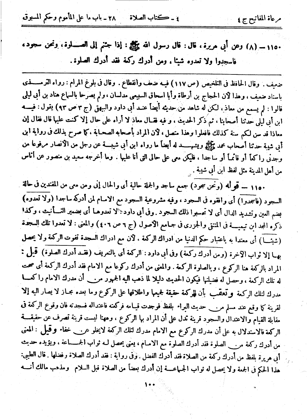 1150- (8) وعن أبي هريرة، قال: قال رسول الله - صلى الله عليه وسلم -: ((إذا جئتم إلى الصلاة، ونحن سجود، فاسجدوا ولا تعدوه شيئاً، ومن أدرك ركعة فقد أدرك الصلاة)) .