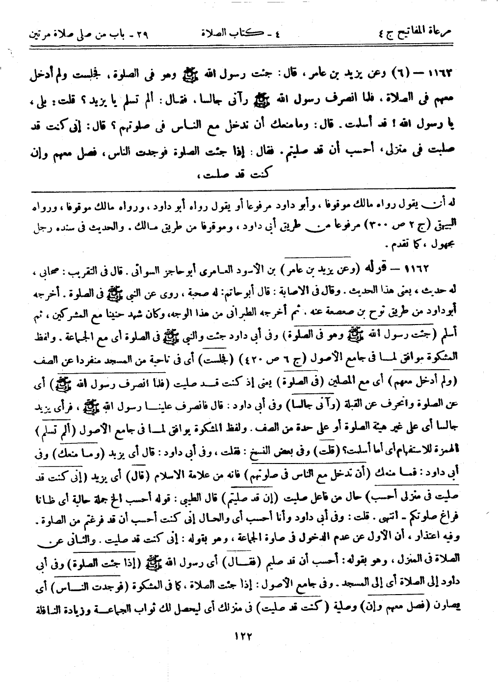 1162- قوله. (وعن يزيد بن عامر) بن الأسود العامري أبوحاجز السوائي. قال في التقريب: صحابي، له حديث، يعني هذا الحديث. وقال في الإصابة: قال أبوحاتم: له صحبة، روى عن النبي - صلى الله عليه وسلم - في الصلاة. أخرجه أبوداود من طريق نوح بن صعصعة عنه. ثم أخرجه الطبراني من هذا الوجه، وكان شهد حنيناً مع المشركين، ثم أسلم (جئت رسول الله - صلى الله عليه وسلم - وهو في الصلاة) وفي أبي داود جئت والنبي - صلى الله عليه وسلم - في الصلاة أي مع الجماعة. ولفظ المشكاة موافق لما في جامع الأصول (ج6 ص420) . (فجلست) أي في ناحية من المسجد منفرداً عن الصف. (ولم أدخل معهم) أي مع المصلين. (في الصلاة) يعني إذا كنت قد صليت. (فلما انصرف رسول الله - صلى الله عليه وسلم -) أي عن الصلاة وانحرف عن القبلة. (رآني جالساً) وفي أبي داود: قال فانصرف علينا رسول الله - صلى الله عليه وسلم -، فرأى يزيد جالساً، أي على غير هيئة الصلاة أو على حدة من الصف. ولفظ المشكاة يوافق لما في جامع الأصول. (ألم تسلم) الهمزة للاستفهام أي أما أسلمت؟ (قلت) وفي بعض النسخ: فقلت: وفي أبي داود: قال أي يزيد. (وما منعك) وفي أبي داود: فما منعك. (أن تدخل مع الناس في صلاتهم) فإنه من علامة الإسلام. (قال) أي يزيد. (إني كنت قد صليت في منزلي أحسب) حال من فاعل صليت. (إن قد صليتم) قال الطيبي: قوله أحسب الخ جملة حالية أي ظاناً فراغ صلاتكم- انتهى. قلت: وفي أبي داود وأنا أحسب أي والحال إني كنت قد أحسب أن قد فرغتم من الصلاة. وفيه اعتذار، أن الأول عن عدم الدخول في صلاة الجماعة، وهو بقوله: إني كنت قد صليت. والثاني عن الصلاة في المنزل، وهو بقوله: أحسب أن قد صليتم. (فقال) أي رسول الله - صلى الله عليه وسلم -: (إذا جئت الصلاة) وفي أبي داود إلى الصلاة أي إلى المسجد. وفي جامع الأصول: إذا جئت الصلاة، كما في المشكاة. (فوجدت الناس) أي يصلون. (فصل معهم وإن) وصلية. (كنت قد صليت) في منزلك، أي ليحصل لك ثواب الجماعة وزيادة النافلة.