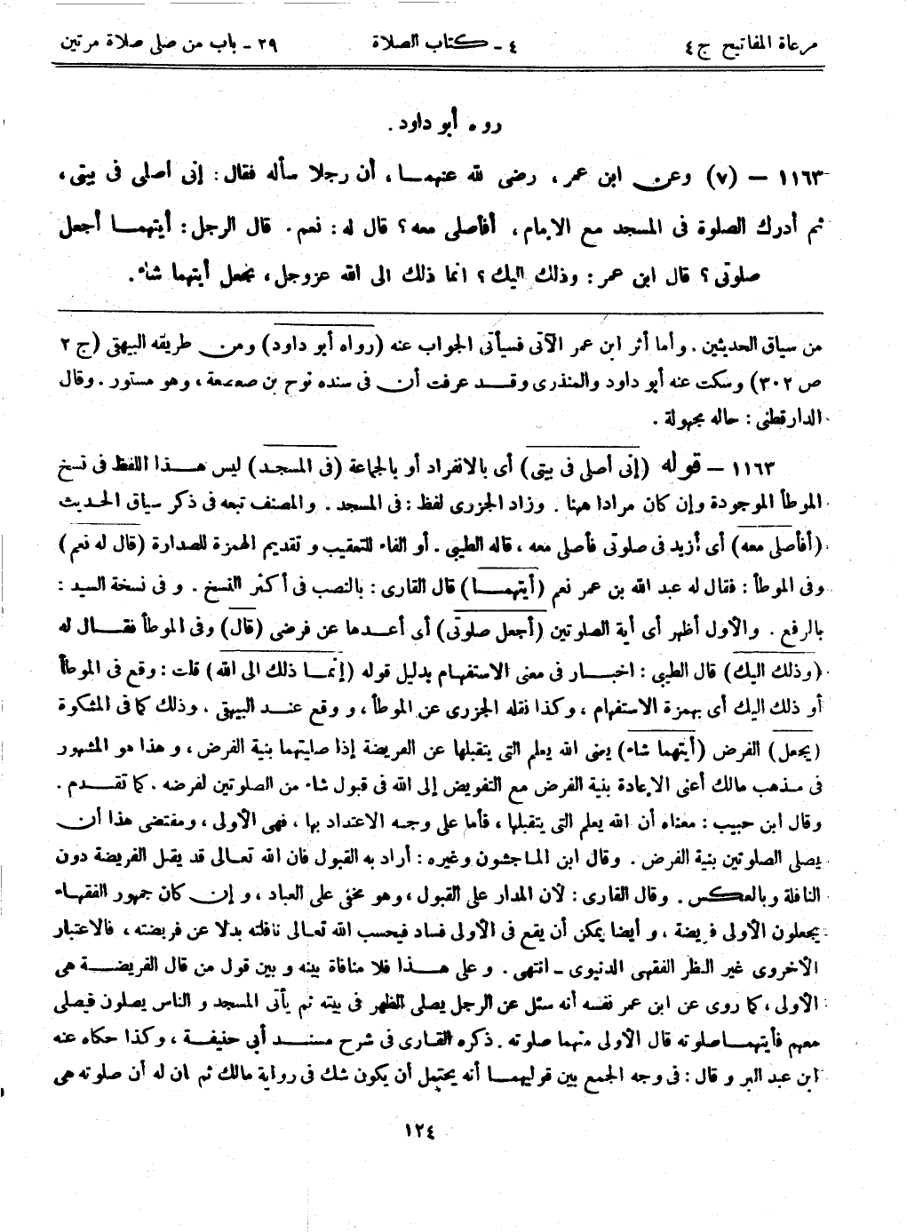 1163- (7) وعن ابن عمر، رضي الله عنهما، ((أن رجلاً سأله فقال: إني أصلي في بيتي، ثم أدرك الصلاة في المسجد مع الإمام، أفأصلى معه؟ قال له: نعم. قال الرجل: أيتهما أجعل صلاتي؟ قال ابن عمر: وذلك إليك؟ إنما ذلك إلى الله عزوجل، يجعل أيتهما شاء)) .