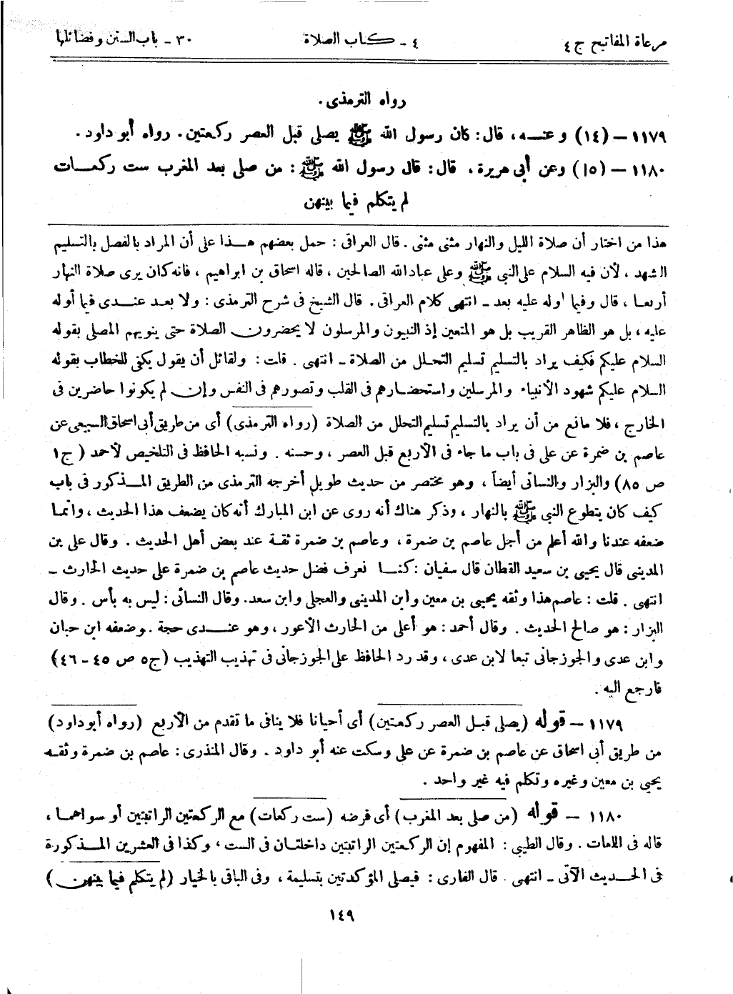 1179- قوله: (يصلي قبل العصر ركعتين) أي أحياناً فلا ينافي ما تقدم من الأربع. (رواه أبوداود) من طريق أبي إسحاق عن عاصم بن ضمرة عن علي وسكت عنه أبوداود. وقال المنذري: عاصم بن ضمرة وثقه يحيى بن معين وغيره وتكلم فيه غير واحد.