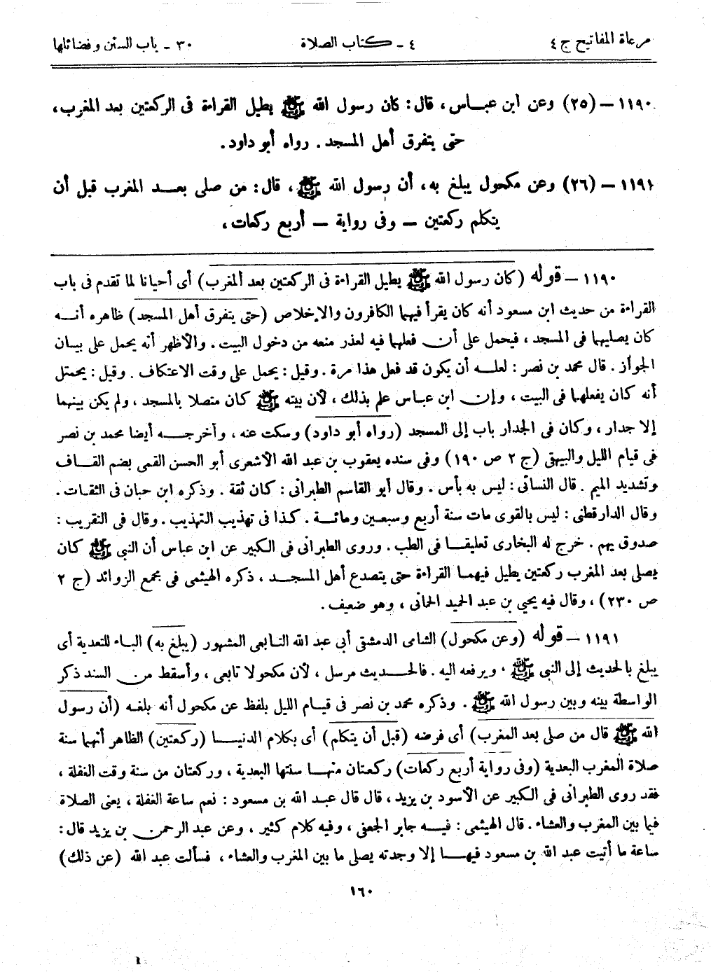 1191- (26) وعن مكحول يبلغ به، ((أن رسول الله - صلى الله عليه وسلم -، قال: من صلى بعد المغرب قبل أن يتكلم ركعتين)) ـ وفي رواية ـ. ((أربع ركعات)) ،