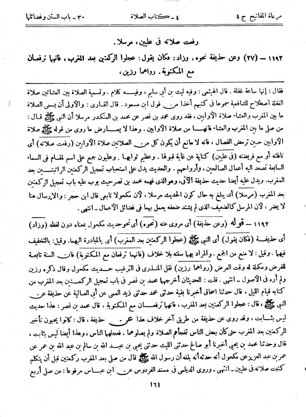 1192- (27) وعن حذيفة نحوه، وزاد: فكان يقول: ((عجلوا الركعتين بعد المغرب، فإنها ترفعان