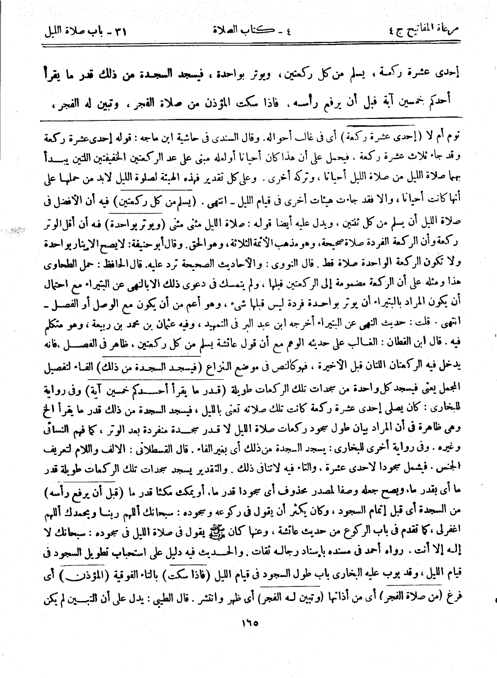 نوم أم لا. (إحدى عشرة ركعة) أي في غالب أحواله. وقال السندي في حاشية ابن ماجه: قوله إحدى عشرة ركعة وقد جاء ثلاث عشرة ركعة. فيحمل على أن هذا كان أحياناً، أو لعله مبني على عد الركعتين الخفيفتين اللتين يبدأ بهما صلاة الليل من صلاة الليل أحياناً، وتركه أخرى. وعلى كل تقدير فهذه الهيئة لصلاة الليل لا بد من حملها على أنها كانت أحياناً، وإلا فقد جاءت هيئات أخرى في قيام الليل-انتهى. (يسلم من كل ركعتين) فيه أن الأفضل في صلاة الليل أن يسلم من كل ثنتين، ويدل عليه أيضاً قوله: صلاة الليل مثنى مثنى. (ويوتر بواحدة) فيه أن أقل الوتر ركعة وأن الركعة الفردة صلاة صحيحة، وهو مذهب الأئمة الثلاثة، وهو الحق. وقال أبوحنيفة: لا يصح الإيتار بواحدة ولا تكون الركعة الواحدة صلاة قط. قال النووي: والأحاديث الصحيحة ترد عليه. قال الحافظ: حمل الطحاوي هذا ومثله على أن الركعة مضمومة إلى الركعتين قبلها، ولم يتمسك في دعوى ذلك إلا بالنهي عن البتيراء، مع احتمال أن يكون المراد بالبتيراء أن يوتر بواحدة فردة ليس قبلها شيء، وهو أعم من أن يكون مع الوصل أو الفصل- انتهى. قلت: حديث النهي عن البتيراء أخرجه ابن عبد البر في التمهيد، وفيه عثمان بن محمد بن ربيعة، وهو متكلم فيه. قال ابن القطان: الغالب على حديثه الوهم، مع أن قول عائشة: يسلم من كل ركعتين، ظاهر في الفصل فإنه يدخل في الركعتان اللتان قبل الأخيرة، فهو كالنص في موضع النزاع. (فيسجد سجدة من ذلك) الفاء لتفصيل المجمل يعني فيسجد كل واحدة من سجدات تلك الركعات طويلة. (قدر ما يقرأ أحدكم خمسين آية) وفي رواية للبخاري: كان يصلي إحدى عشرة ركعة كانت تلك صلاته تعني بالليل، فيسجد السجدة من ذلك قدر ما يقرأ الخ. وهي ظاهرة في أن المراد بيان طول سجود ركعات صلاة الليل، لا قدر سجدة منفردة بعد الوتر، كما فهم النسائي وغيره. وفي رواية أخرى للبخاري: يسجد السجدة من ذلك أي بغير الفاء. قال القسطلاني: الألف واللام لتعريف الجنس. فيشمل سجود لإحدى عشرة، والتاء فيه لا تنافي ذلك. والتقدير يسجد سجدات تلك الركعات طويلة قدر ما، أي بقدر ما، ويصح جعله صفا لمصدر محذوف، أي سجودا قدر ما، أو يمكث مكثا قدر ما. (قبل أن يرفع رأسه) من السجدة أي قبل إتمام السجود، وكان يكثر أن يقول في ركوعه وسجوده: سبحانك اللهم ربنا وبحمدك، اللهم اغفر لي، كما تقدم في باب الركوع من حديث عائشة، وعنها كان - صلى الله عليه وسلم - يقول في صلاة الليل في سجوده: سبحانك لا إله إلا أنت. رواه أحمد في مسنده بإسناد رجاله ثقات. والحديث فيه دليل على استحباب تطويل السجود في قيام الليل، وقد بوب عليه البخاري باب طول السجود في قيام الليل. (فإذا سكت) بالتاء الفوقية. (المؤذن) أي فرغ. (من صلاة الفجر) أي من أذانها. (وتبين له الفجر) أي ظهر وانتشر. قال الطيبي: يدل على أن التبين لم يكن