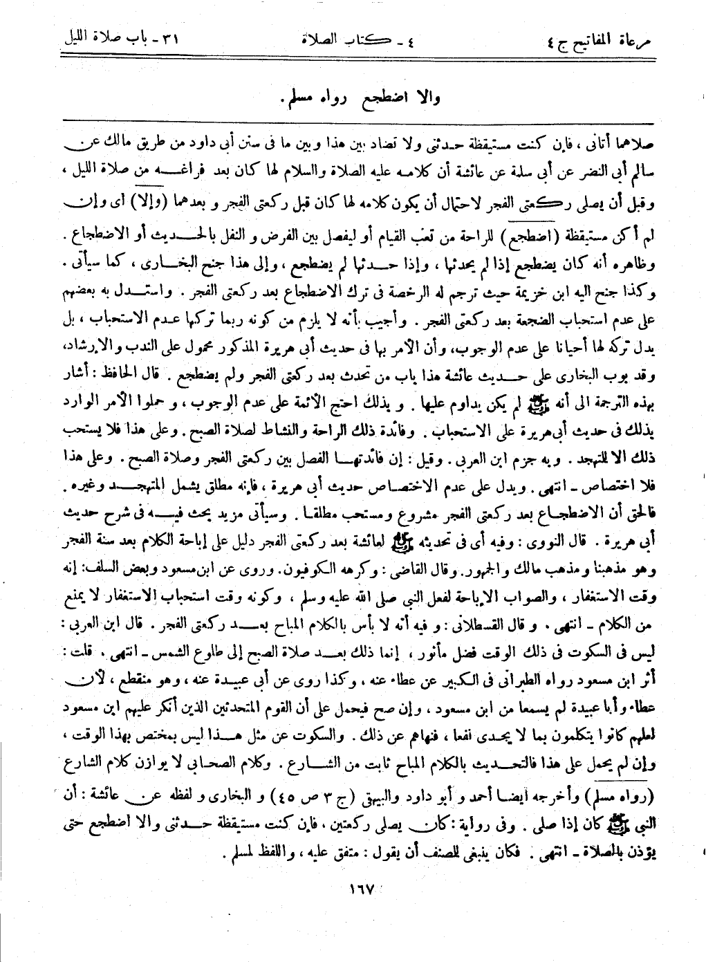 صلاهما أتاني، فإن كنت مستيقظة حدثني ولا تضاد بين هذا وبين ما في سنن أبي داود من طريق مالك عن سالم بن أبي النضر عن أبي سلمة عن عائشة أن كلامه عليه الصلاة والسلام لها كان بعد فراغه من صلاة الليل، وقبل أن يصلي ركعتي الفجر، لاحتمال أن يكون كلامه لها كان قبل ركعتي الفجر وبعدهما. (وإلا) أي وإن لم أكن مستيقظة. (اضطجع) للراحة من تعب القيام أو ليفصل بين الفرض والنفل بالحديث أو الاضطجاع. وظاهره أنه كان يضطجع إذا لم يحدثها، وإذا حدثها لم يضطجع، وإلى هذا جنح البخاري، كما سيأتي. وكذا جنح إليه ابن خزيمة حيث ترجم له الرخصة في ترك الاضطجاع بعد ركعتي الفجر. واستدل به بعضهم على عدم استحباب الضجعة بعد ركعتي الفجر. وأجيب بأنه لا يلزم من كونه ربما تركها عدم الاستحباب، بل يدل تركه لها أحياناً على عدم الوجوب، وأن الأمر بها في حديث أبي هريرة المذكور محمول على الندب والإرشاد، وقد بوب البخاري على حديث عائشة هذا الباب: من تحدث بعد ركعتي الفجر ولم يضطجع. قال الحافظ: أشار بهذه الترجمة إلى أنه - صلى الله عليه وسلم - لم يكن يداوم عليها. وبذلك احتج الأئمة على عدم الوجوب، وحملوا الأمر الوارد بذلك في حديث أبي هريرة على الاستحباب. وفائدة ذلك الراحة والنشاط لصلاة الصبح. وعلى هذا فلا يستحب ذلك إلا للمتهجد. وبه جزم ابن العربي. وقيل: إن فائدتها الفصل بين ركعتي الفجر وصلاة الصبح. وعلى هذا فلا اختصاص- انتهى. ويدل على عدم الاختصاص حديث أبي هريرة، فإنه مطلق يشمل المتهجد وغيره. فالحق أن الاضطجاع بعد ركعتي الفجر مشروع ومستحب مطلقاً. وسيأتي مزيد بحث فيه في شرح حديث أبي هريرة. قال النووي: وفيه أي في تحديثه - صلى الله عليه وسلم - لعائشة بعد ركعتي الفجر دليل على إباحة الكلام بعد سنة الفجر وهو مذهبنا ومذهب مالك والجمهور. وقال القاضي: وكره الكوفيون. وروى عن ابن مسعود وبعض السلف: إنه وقت الاستغفار، والصواب الإباحة لفعل النبي - صلى الله عليه وسلم -، وكونه وقت استحباب الاستغفار لا يمنع من الكلام- انتهى. وقال القسطلاني: وفيه أنه لا بأس بالكلام المباح بعد ركعتي الفجر. قال ابن العربي: ليس في السكوت في ذلك الوقت فضل مأثور، إنما ذلك بعد صلاة الصبح إلى طلوع الشمس-انتهى. قلت: أثر ابن مسعود رواه الطبراني في الكبير عن عطاء عنه، وكذا روي عن أبي عبيدة عنه، هو منقطع، لأن عطاء وأبا عبيدة لم يسمعا من ابن مسعود، وإن صح فيحمل على أن القوم المتحدثين الذين أنكر عليهم ابن مسعود لعلهم كانوا يتكلمون بما لا يجدي نفعاً، فنهاهم عن ذلك. والسكوت عن مثل هذا ليس بمختص بهذا الوقت، وإن لم يحتمل على هذا فالتحديث بالكلام المباح ثابت من الشارع. وكلام الصحابي لا يوازن كلام الشارع. (رواه مسلم) وأخرجه أيضاً أحمد وأبوداود والبيهقي (ج3 ص45) والبخاري ولفظه عن عائشة: أن النبي - صلى الله عليه وسلم - كان إذا صلى. وفي رواية: كان يصلي ركعتين، فإن كنت مستيقظة حدثني وإلا اضطجع حتى يؤذن بالصلاة- انتهى. فكان ينبغي للمصنف أن يقول: متفق عليه، واللفظ لمسلم.