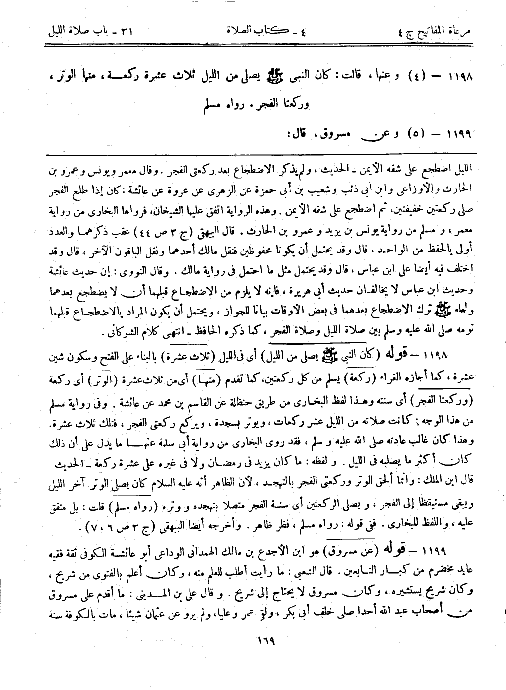 1198- (4) وعنها، قالت: ((كان النبي - صلى الله عليه وسلم - يصلي من الليل ثلاث عشرة ركعة، منها الوتر، وركعتا الفجر)) . رواه مسلم.