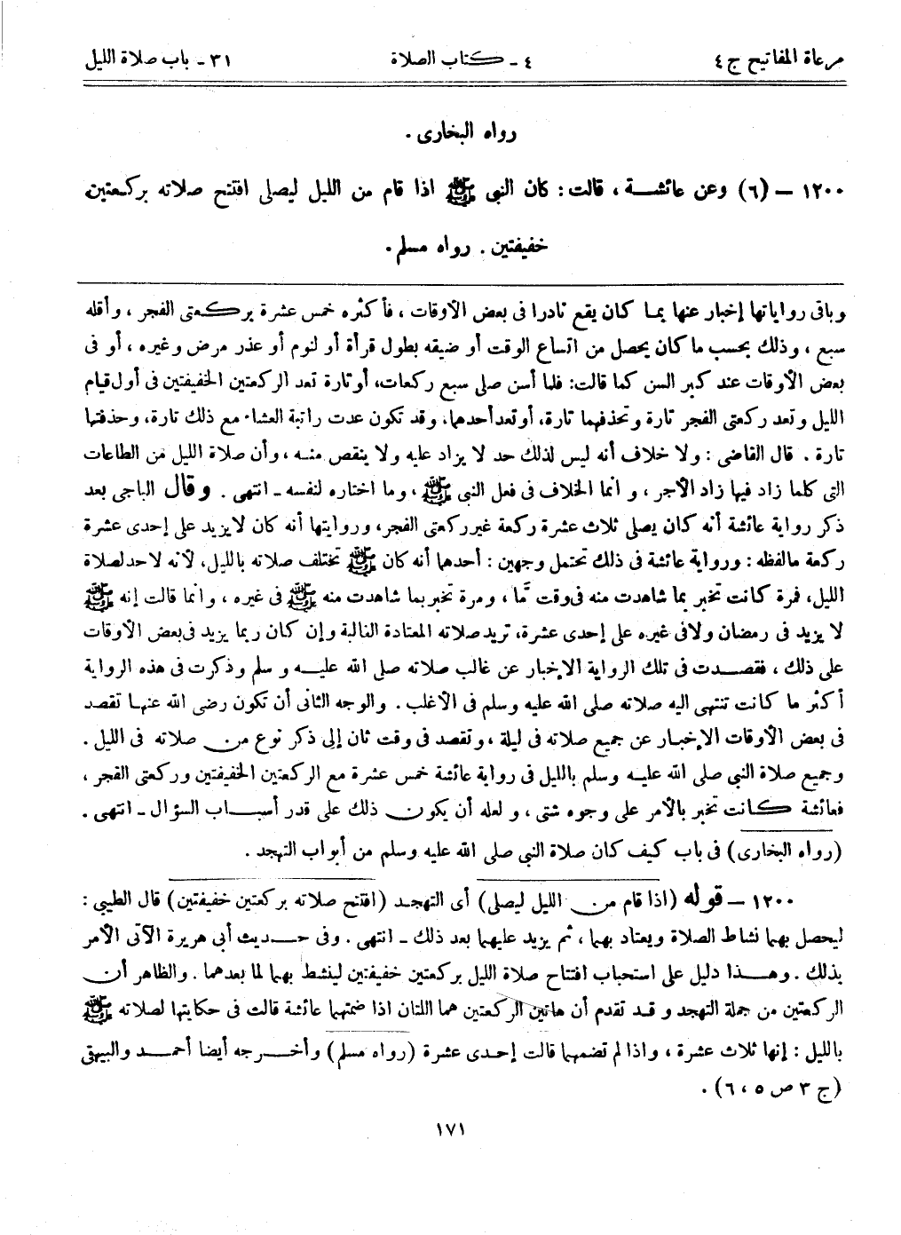 1200- (6) وعن عائشة، قالت: ((كان النبي - صلى الله عليه وسلم - إذا قام من الليل ليصلي افتتح صلاته بركعتين