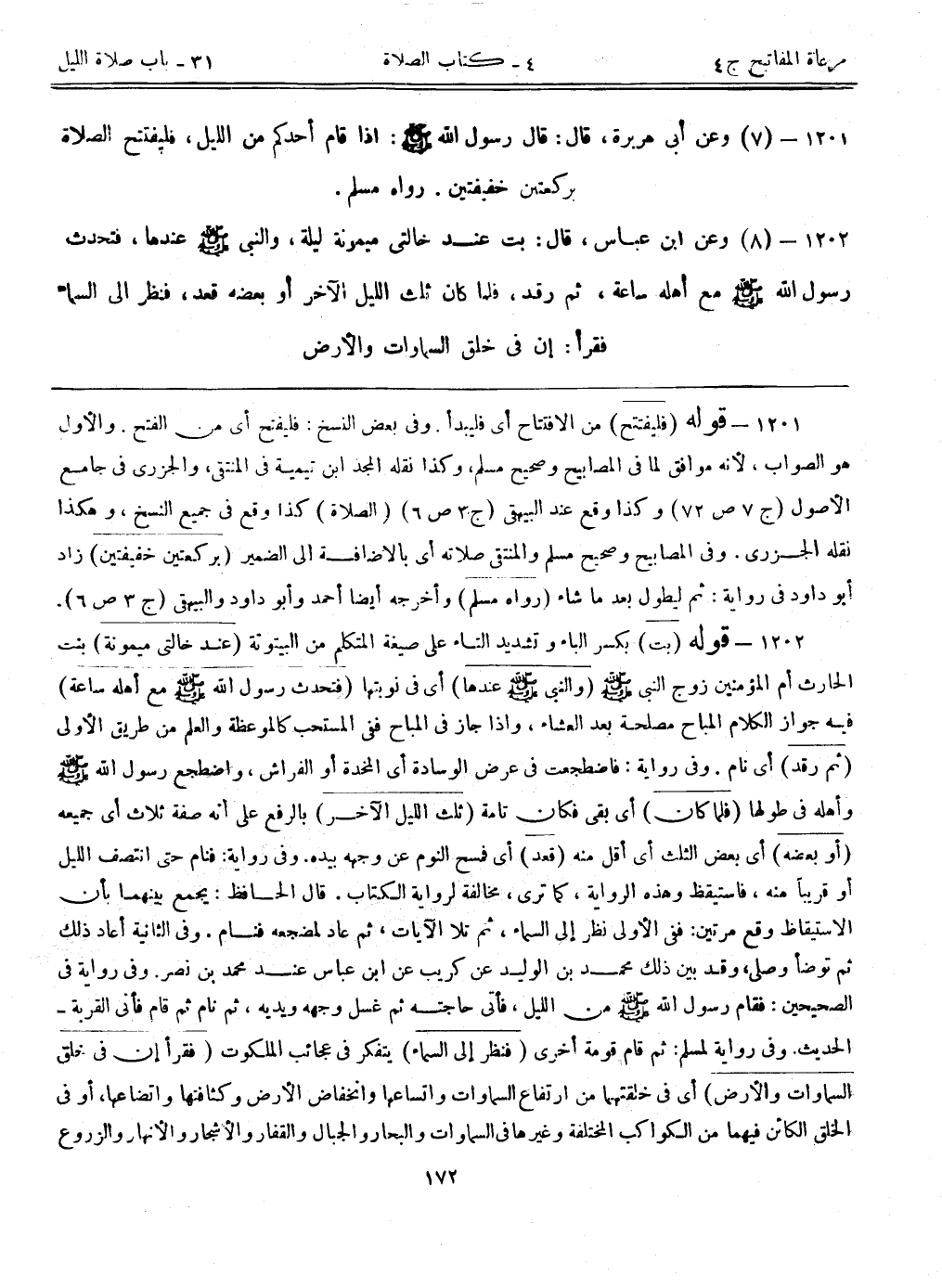 1202- قوله: (بت) بكسر الباء وتشديد التاء على صيغة المتكلم من البيتوتة. (عند خالتي ميمونة) بنت الحارث أم المؤمنين زوج النبي - صلى الله عليه وسلم -. (والنبي - صلى الله عليه وسلم - عندها) أي في نوبتها. (فتحدث رسول الله - صلى الله عليه وسلم - مع أهله ساعة) فيه جواز الكلام المباح مصلحة بعد العشاء، وإذا جاز في المباح ففي المستحب كالموعظة والعلم من طريق الأولى. (ثم رقد) أي نام. وفي رواية: فاضطجعت في عرض الوسادة أي المخدة أو الفراش، واضطجع رسول الله - صلى الله عليه وسلم - وأهله في طولها. (فلما كان) أي بقي فكان تامة. (ثلث الليل الآخر) بالرفع على أنه صفة ثلاث أي جميعه. (أو بعضه) أي بعض الثلث أي أقل منه. (قعد) أي فمسح النوم عن وجهه بيده. وفي رواية: فنام حتى انتصف الليل أو قريباً منه، فاستيقظ وهذه الرواية، كما ترى، مخالفة لرواية الكتاب. قال الحافظ: يجمع بينهما بأن الاستيقاظ وقع مرتين: ففي الأولى نظر إلى السماء، ثم تلا الآيات، ثم عاد لمضجعه فنام. وفي الثانية أعاد ذلك ثم توضأ وصلى، وقد بين ذلك محمد بن الوليد عن كريب عن ابن عباس عند محمد بن نصر. وفي رواية في الصحيحين: فقام رسول الله - صلى الله عليه وسلم - من الليل، فأتى حاجته ثم غسل وجهه ويديه، ثم نام ثم قام فأتى قربة- الحديث. وفي رواية لمسلم: ثم قام قومه أخرى. (فنظر إلى السماء) يتفكر في عجائب الملكوت. (فقرأ إن في خلق السماوات والأرض) أي في خلقتهما من ارتفاع السماوات واتساعها وانخفاض الأرض وكثافتها واتضاعها، أو في الخلق الكائن فيهما من الكواكب المختلفة وغيرها في السماوات والبحار والجبال والقفار والأشجار والأنهار والزروع