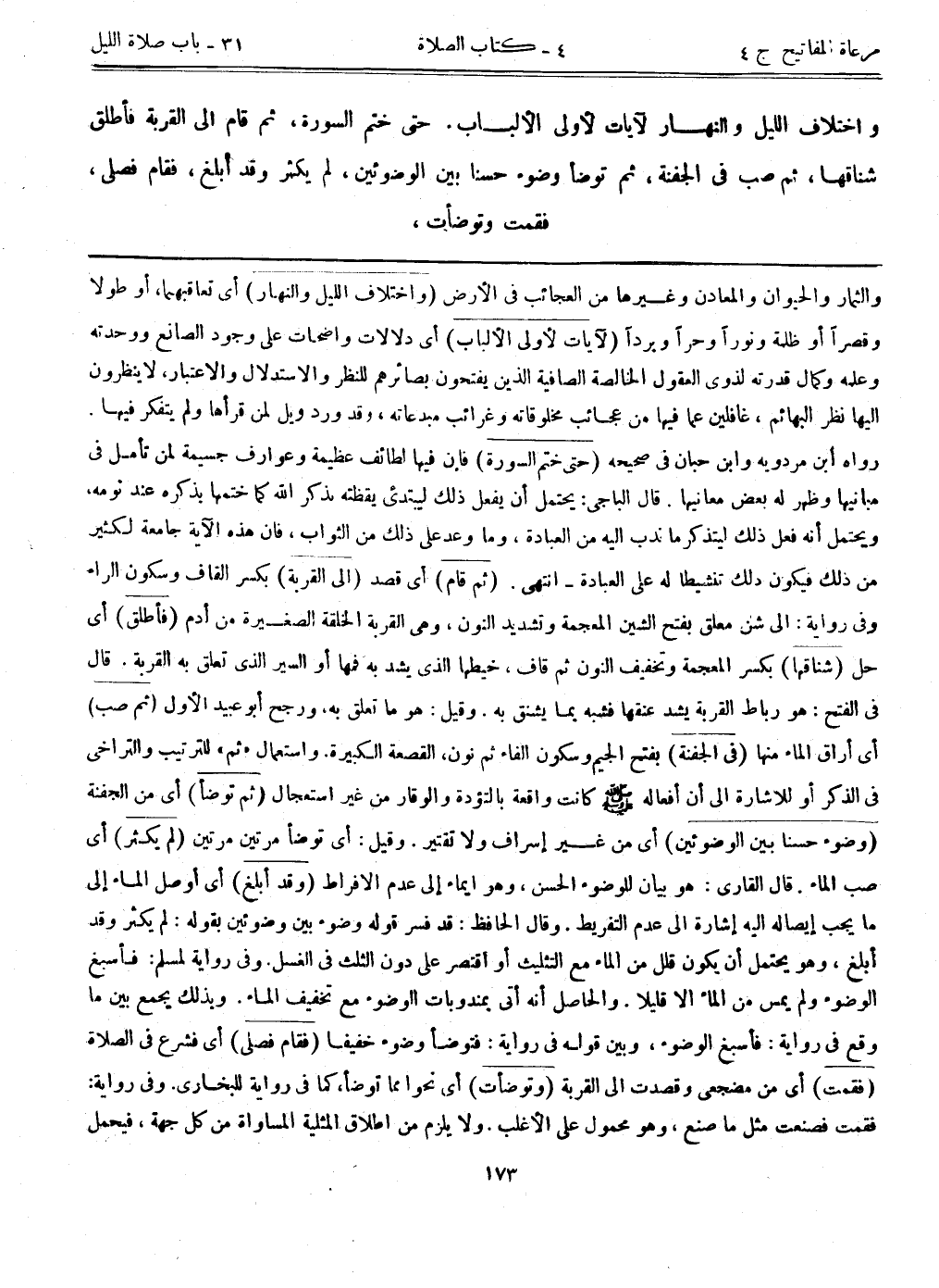والثمار والحيوان والمعادن وغيرها من العجائب في الأرض. (واختلاف الليل والنهار) أي في تعاقبهما، أو طولاً وقصراً أو ظلمة ونوراً وحراً وبرداً (لآيات لأولى الألباب) أي دلالات واضحات على وجود الصانع ووحدته وعلمه وكمال قدرته لذوي العقول الخالصة الصافية، الذين يفتحون بصائرهم للنظر والاستدلال والاعتبار، لا ينظرون إليها نظر البهائم، غافلين عما فيها من عجائب مخلوقاته وغرائب مبدعاته، وقد ورد ويل لمن قرأها ولم يتفكر فيها. رواه ابن مردويه وابن حبان في صحيحه. (حتى ختم السورة) فإن فيها لطائف عظيمة وعوارف جسيمة لمن تأمل في مبانيها وظهر له بعض معانيها. قال الباجي: يحتمل أن يفعل ذلك ليبتدئ يقظته بذكر الله كما ختمها بذكره عند نومه، ويحتمل أنه فعل ذلك ليتذكر ما ندب إليه من العبادة، وما وعد على ذلك من الثواب، فإن هذه الآية جامعة لكثير من ذلك، فيكون ذلك تنشيطاً له على العبادة- انتهى. (ثم قام) أي قصد. (إلى القربة) بكسر القاف وسكون الراء وفي رواية: إلى شن معلق بفتح الشين المعجمة وتشديد النون، وهي القربة الخلقة الصغيرة من أدم. (فأطلق) أي حل. (شناقها) بكسر المعجمة وتخفيف النون ثم قاف، خيطها الذي يشد به فمها أو السير الذي تعلق به القربة. قال في الفتح: هو رباط القربة يشد عنقها فشبه بما يشنق به. وقيل: هو ما تعلق به، ورجح أبوعبيد الأول. (ثم صب) أي أراق الماء منها. (في الجفنة) بفتح الجيم وسكون الفاء ثم نون، القصعة الكبيرة. واستعمال "ثم" للترتيب والتراخي في الذكر أو للإشارة إلى أن أفعاله - صلى الله عليه وسلم - كانت واقعة بالتؤدة والوقار من غير استعجال. (ثم توضأ) أي من الجفنة. (وضوء حسناً بين الوضوئين) أي من غير إسراف ولا تقتير. وقيل: أي توضأ مرتين مرتين. (لم يكثر) أي صب الماء. قال القاري: هو بيان للوضوء الحسن، وهو إيماء إلى عدم الإفراط. (وقد أبلغ) أي أوصل الماء إلى ما يجب إيصاله إليه إشارة إلى عدم التفريط. وقال الحافظ: قد فسر قوله: وضوء بين وضوئين بقوله: لم يكثر وقد أبلغ، وهو يحتمل أن يكون قلل من الماء مع التثليث، أو اقتصر على دون الثلث في الغسل. وفي رواية لمسلم: فأسبغ الوضوء ولم يمس من الماء إلا قليلاً. والحاصل أنه أتى بمندوبات الوضوء مع التخفيف الماء. وبذلك يجمع بين ما وقع في رواية: فأسبغ الوضوء، وبين قوله في رواية: فتوضأ وضوءاً خفيفاً. (فقام فصلى) أي فشرع في الصلاة. (فقمت) أي من مضجعي وقصدت إلى القربة. (وتوضأت) أي نحو مما توضأ، كما في رواية للبخاري. وفي رواية: فقمت فصنعت مثل ما صنع، وهو محمول على الأغلب. ولا يلزم من إطلاق المثلية المساواة من كل جهة، فيحمل