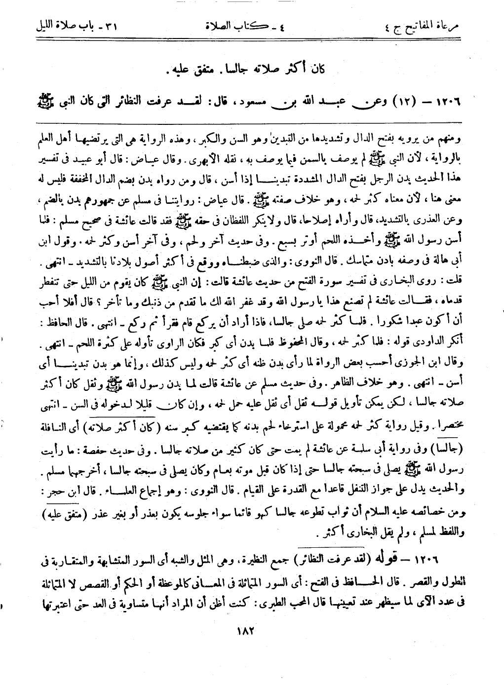 1206- قوله: (لقد عرفت النظائر) جمع نظيرة، وهي المثل والشبه أي السور المتشابهة والمتقاربة في الطول والقصر. قال الحافظ في الفتح: أي السور المتماثلة في المعاني كالموعظة أو الحكم أو القصص، لا المتماثلة في عدد الآي لما سيظهر عند تعيينها. قال المحب الطبري: كنت أظن أن المراد أنها متساوية في العد حتى اعتبرتها