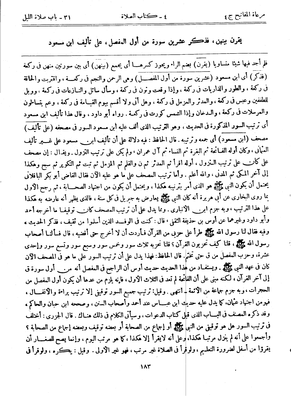 فلم أجد فيها شيئاً متساوياً. (يقرن) بضم الراء ويجوز كسرها أي يجمع. (بينهن) أي بين سورتين منهن في ركعة. (فذكر) أي ابن مسعود. (عشرين سورة من أول المفصل) وهي الرحمن والنجم في ركعة، واقتربت والحاقة في ركعة، والطور والذاريات في ركعة، وإذا وقعت ونون في ركعة، وسأل سائل والنازعات في ركعة، وويل للمطففين وعبس في ركعة، والمدثر والمزمل في ركعة، وهل آتي ولا أقسم بيوم القيامة في ركعة، وعم يتسآءلون والمرسلاًت في ركعة، والدخان وإذا الشمس كورت في ركعة. رواه أبوداود، وقال هذا تأليف ابن مسعود أي ترتيب السور المذكورة في الحديث، وهو الترتيب الذي ألف عليه ابن مسعود السور في مصحفه. (على تأليف) مصحف (ابن مسعود) أي جمعه وترتيبه. قال الحافظ: فيد دلالة على أن تأليف ابن مسعود على غير تأليف العثماني، وكان أوله الفاتحة ثم البقرة ثم النساء ثم آل عمران، ولم يكن على ترتيب النزول. ويقال: إن مصحف على كان ترتيب النزول، أوله إقرأ ثم المدثر ثم ن والقلم ثم المزمل ثم تبت ثم التكوير ثم سبح وهكذا إلى آخر المكي ثم المدني، والله أعلم. وأما ترتيب المصحف على ما هو عليه الآن فقال القاضي أبوبكر الباقلاني: يحتمل أن يكون النبي - صلى الله عليه وسلم - هو الذي أمر بترتيبه هكذا، ويحتمل أن يكون من اجتهاد الصحابة، ثم رجح الأول بما روى البخاري عن أبي هريرة أنه كان النبي - صلى الله عليه وسلم - يعارض به جبريل في كل سنة، فالذي يظهر أنه عارضه به هكذا على هذا الترتيب، وبه جزم ابن الأنباري. ومما يدل على أن ترتيب المصحف كان توقيفاً ما أخرجه أحمد وأبوداود وغيرهما عن أوس بن حذيفة الثقفي، قال: كنت في الوفد الذين أسلموا من ثقيف، فذكر الحديث، وفيه فقال لنا رسول الله - صلى الله عليه وسلم -: طرأ على حزبي من القرآن فأردت أن لا أخرج حتى أقضيه، قال: فسألنا أصحاب رسول الله - صلى الله عليه وسلم -، قلنا كيف تحزبون القرآن؟ قلنا نحزبه ثلاث سور وخمس سور وسبع سور وتسع سور وإحدى عشرة، وحزب المفصل من ق حتى تختم. قال الحافظ: فهذا يدل على أن ترتيب السور على ما هو في المصحف الآن كان في عهد النبي - صلى الله عليه وسلم -. ويستفاد من هذا الحديث حديث أوس أن الراجح في المفصل أنه من أول سورة ق إلى آخر القرآن، لكنه مبني على أن الفاتحة لم تعد في الثلاث الأول، فإنه يلزم من عدها أن يكون أول المفصل من الحجرات، وبه جزم جماعة من الأئمة- انتهى. وقيل: ترتيب جميع السور توقيفي إلا ترتيب براءة والأنفال، فهو من اجتهاد عثمان، كما يدل عليه حديث ابن عباس عند أحمد وأصحاب السنن، وصححه ابن حبان والحاكم، وقد ذكره المصنف في الباب الذي قبل كتاب الدعوات، وسيأتي الكلام في ذلك هناك. قال الجزري: اختلف في ترتيب السور هل هو توقيفي من النبي - صلى الله عليه وسلم - أو إجماع من الصحابة، أو بعضه توقيف وبعضه إجماع من الصحابة؟ وأجمعوا على أنه لم ينزل مرتباً هكذا، وعلى أنه لا يقرأ إلا هكذا، كما هو مرتب اليوم، وإنما يصح للصغار أن يقرؤا من أسفل لضرورة التعليم، ولو قرأ في الصلاة غير مرتب، فهو غير أولى. وقيل: يكره، ولو قرأ في