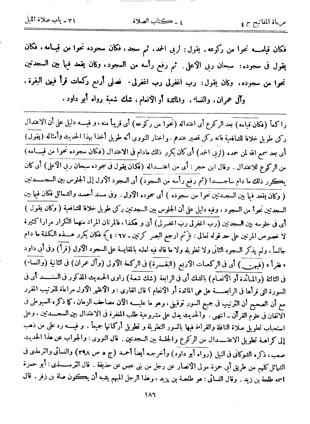 راكعاً (فكان قيامه) بعد الركوع أي اعتداله. (نحواً من ركوعه) أي قريباً منه، وفيه دليل على أن الاعتدال ركن طويل خلافاً للشافعية فإنه ركن قصير عندهم. واختار النووي أنه طويل أخذاً بهذا الحديث وأمثاله. (يقول) أي بعد سمع الله لمن حمده (لربي الحمد) أي كان يكرر ذلك مادام في الاعتدال. (فكان سجوده نحواً من قيامه) من الركوع للاعتدال. قال ابن حجر: أي من اعتداله. (فكان يقول في سجوده سبحان ربي الأعلى) أي كان يكرر ذلك مادام ساجداً. (ثم رفع رأسه من السجود) أي السجود الأول إلى الجلوس بين السجدتين. (وكان يقعد فيما بين السجدتين نحواً من سجوده) أي سجوده الأول. وفي مسند أحمد والشمائل فكان فيما بين السجدتين نحواً من السجود، وفيه دليل على أن الجلوس بين السجدتين ركن طويل خلافاً للشافعية. (وكان يقول) أي في جلوسه بين السجدتين. (رب اغفر لي رب اغفر لي) أي وهكذا، فالمرتان المراد منهما التكرار مراراً كثيرة لا خصوص المرتين على حد قوله تعالى: {ثم ارجع البصر كرتين} [67: 4] ، فكان يكرر هذه الكلمة مادام جالساً، ولم يذكر السجود الثاني ولا تطويله ولا ما قاله فيه لعلمه بالمقايسة على السجود الأول. (قرأ) وفي أبي داود "فقرأ". (فيهن) أي في الركعات الأربع. (البقرة) في الركعة الأولى. (وآل عمران) في الثانية. (والنساء) في الثالثة. (والمائدة أو الأنعام) بالشك أي في الرابعة. (شك شعبة) راوي الحديث المذكور في السند، أي في السورة التي قرأها في الرابعة هل هي المائدة أو الأنعام؟ قال القاري: والأظهر الأول مراعاة للترتيب المقرر، مع أن الصحيح أن الترتيب في جميع السور توقيفي، وهو ما عليه الآن مصاحف الزمان، كما ذكره السيوطي في الإتقان في علوم القرآن- انتهى. والحديث يدل على مشروعية طلب المغفرة في الاعتدال بين السجدتين، وعلى استحباب تطويل صلاة النافلة والقراءة فيها بالسور الطويلة وتطويل أركانها جميعاً. وفيه رد على من ذهب إلى كراهة تطويل الاعتدال من الركوع والجلسة بين السجدتين. قال النووي: والجواب عن هذا الحديث صعب، ذكره الشوكاني في النيل. (رواه أبوداود) وأخرجه أيضاً أحمد (ج5 ص398) والنسائي والترمذي في الشمائل، كلهم من طريق أبي حمزة مولى الأنصار عن رجل من بني عبس عن حذيفة. قال الترمذي: أبوحمزة اسمه طلحة بن زيد. وقال النسائي: هو طلحة بن يزيد، وهذا الرجل المبهم يشبه أن يكون صلة بني زفر. قال