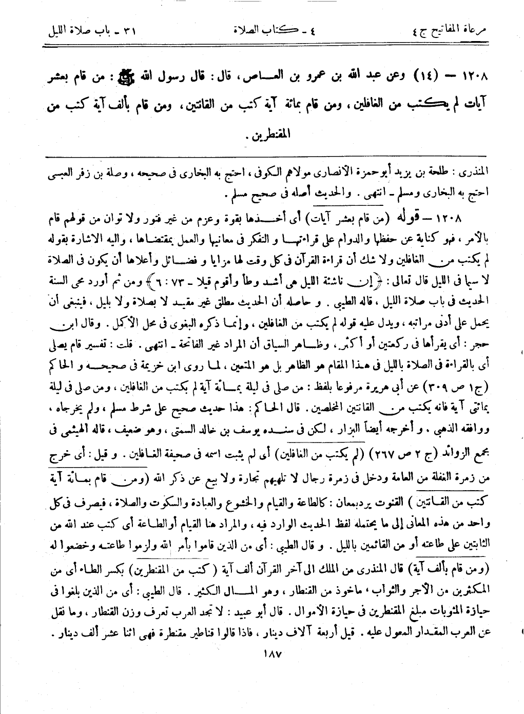 1208- (14) وعن عبد الله بن عمرو بن العاص، قال: قال رسول الله - صلى الله عليه وسلم -: ((من قام بعشر آيات لم يكتب من الغافلين، ومن قام بمائة آية كتب من القانتين، ومن قام بألف آية كتب من المقنطرين)) .