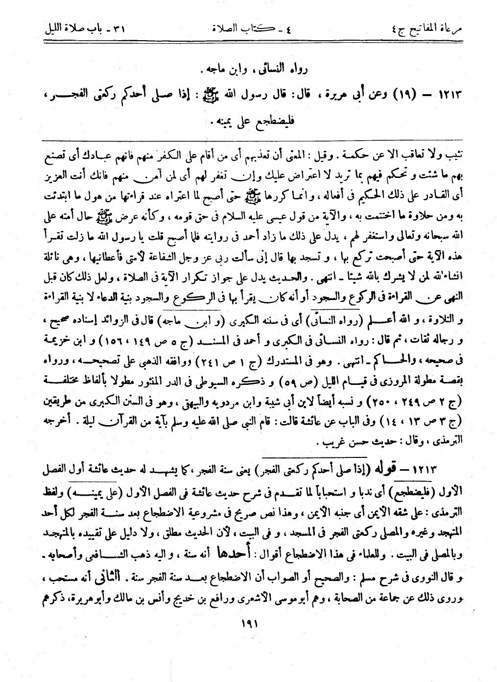 1213- قوله: (إذا صلى أحدكم ركعتي الفجر) يعني سنة الفجر، كما يشهد له حديث عائشة أول الفصل الأول. (فليضطجع) أي ندباً واستحباباً لما تقدم في شرح عائشة في الفصل الأول. (على يمينه) ولفظ الترمذي: على شقه الأيمن أي جنبه الأيمن، وهذا نص صريح في مشروعية الاضطجاع بعد سنة الفجر لكل أحد المتهجد وغيره، والمصلي ركعتي الفجر في المسجد وفي البيت، لأن الحديث مطلق، ولا دليل على تقييده بالمتهجد وبالمصلي في البيت. وللعلماء في هذا الاضطجاع أقوال: أحدها أنه سنة، وإليه ذهب الشافعي وأصحابه. وقال النووي في شرح مسلم: والصحيح أو الصواب أن الاضطجاع بعد سنة الفجر سنة. الثاني أنه مستحب، وروي ذلك عن جماعة من الصحابة، وهم أبوموسى الأشعري ورافع بن خديج وأنس بن مالك وأبوهريرة، ذكرهم