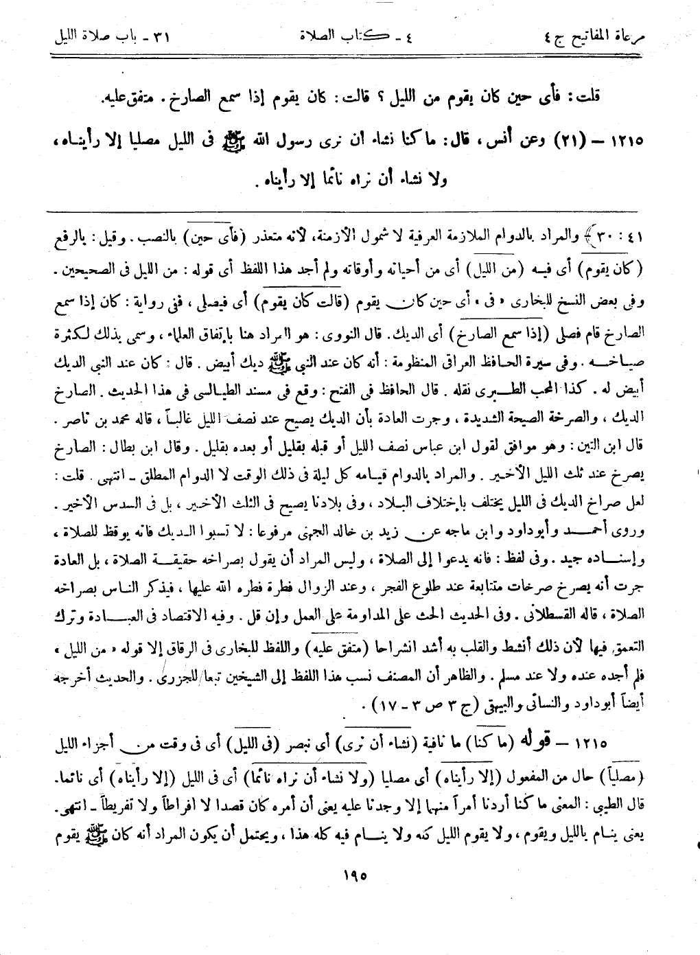 1215- قوله: (ما كنا) ما نافية. (نشاء أن نرى) أي نبصر. (في الليل) أي في وقت من أجزاء الليل. (مصلياً) حال من المفعول. (إلا رأيناه) أي مصلياً. (ولا نشاء أن نراه نائماً) أي في الليل. (إلا رأيناه) أي نائماً. قال الطيبي: المعنى ما كنا أردنا أمرا منهما إلا وجدنا عليه يعني أن أمره كان قصداً لا إفراطاً ولا تفريطاً- انتهى. يعني ينام بالليل ويقوم، ولا يقوم الليل كله ولا ينام فيه كله هذا، ويحتمل أن يكون المراد أنه كان - صلى الله عليه وسلم - يقوم