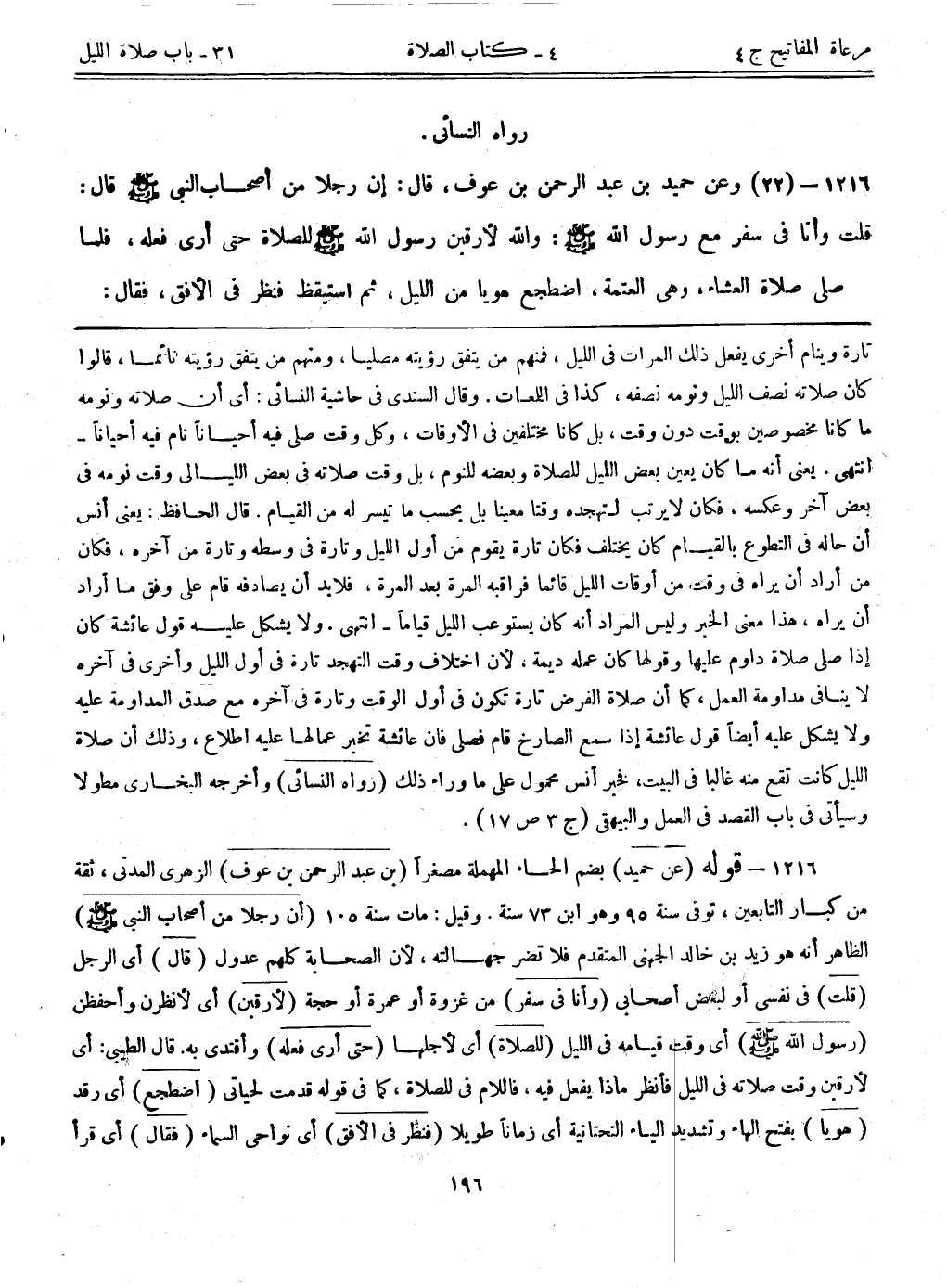 1216- قوله: (عن حميد) بضم الحاء المهملة مصغراً. (بن عبد الرحمن بن عوف) الزهري المدني، ثقة من كبار التابعين، توفي سنة 95 وهو ابن 73 سنة. وقيل: مات سنة 105. (أن رجلاً من أصحاب النبي - صلى الله عليه وسلم -) الظاهر أنه هو زيد بن خالد الجهني المتقدم فلا تضر جهالته، لأن الصحابة كلهم عدول. (قال) أي رجل. (قلت) في نفسي أو لبعض أصحابي. (وأنا في سفر) من غزوة أو عمرة أو حجة. (لأرقبن) أي لأنظرن وأحفظن. (رسول الله - صلى الله عليه وسلم -) أي وقت قيامه في الليل. (للصلاة) أي لأجلها. (حتى أرى فعله) وأقتدي به. قال الطيبي: أي لأرقبن وقت صلاته في الليل فأنظر ماذا يفعل فيه، فاللام في الصلاة، كما في قوله: {قدمت لحياتي} . (اضطجع) أي رقد. (هوياً) بفتح الهاء وتشديد الياء التحتانية أي زماناً طويلاً. (فنظر في الأفق) أي نواحي السماء. (فقال) أي قرأ
