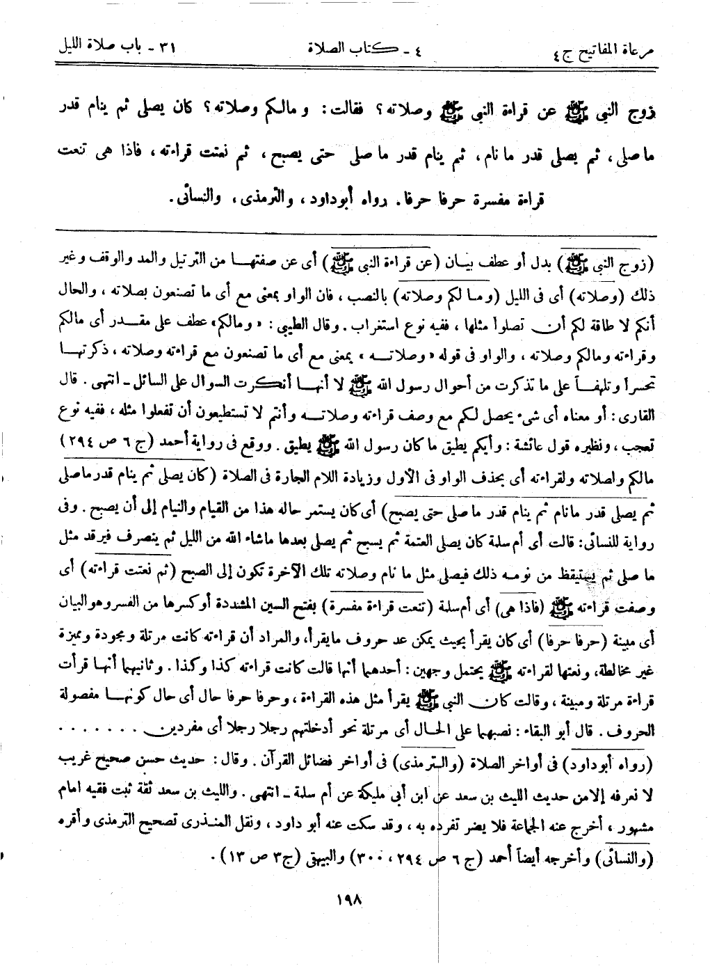 (زوج النبي - صلى الله عليه وسلم -) بدل أو عطف بيان. (عن قراءة النبي - صلى الله عليه وسلم -) أي عن صفتها من الترتيل والمد والوقف وغير ذلك. (وصلاته) أي في الليل. (وما لكم وصلاته) بالنصب، فإن الواو بمعنى مع أي ما تصنعون بصلاته، والحال أنكم لا طاقة لكم أن تصلوا مثلها، ففيه نوع استغراب. وقال الطيبي: "وما لكم" عطف على مقدر، أي مالكم وقراءته وما لكم وصلاته، والواو في قوله "وصلاته" بمعنى مع، أي ما تصنعون مع قراءته وصلاته، ذكرتها تحسراً وتلهفاً على ما تذكرت من أحوال رسول الله - صلى الله عليه وسلم -، لا أنها أنكرت السؤال على السائل- انتهى. قال القاري: أو معناه أي شيء يحصل لكم مع وصف قراءته وصلاته، وأنتم لا تستطيعون أن تفعلوا مثله، ففيه نوع تعجب، ونظيره قول عائشة: وأيكم يطيق ما كان رسول الله - صلى الله عليه وسلم - يطيق. ووقع في رواية أحمد (ج6 ص294) : ما لكم ولصلاته ولقراءته، أي بحذف الواو في الأول وزيادة اللام الجارة في الصلاة. (كان يصلي ثم ينام قدر ما صلى ثم يصلي قدر ما نام ثم ينام قدر ما صلى حتى يصبح) أي كان يستمر حاله هذا من القيام والنيام إلى أن يصبح. وفي رواية للنسائي: قالت أي أم سلمة: كان يصلي العتمة ثم يسبح ثم يصلي بعدها ما شاء الله من الليل ثم ينصرف فيرقد مثل ما صلى ثم يستيقظ من نومه ذلك فيصلي مثل ما نام وصلاته تلك الآخرة تكون إلى الصبح. (ثم نعتت قراءته) أي وصفت قراءته - صلى الله عليه وسلم -. (فإذا هي) أي أم سلمة. (تنعت قراءة مفسرة) بفتح السين المشددة أو كسرها من الفسر وهو البيان أي مبينة. (حرفاً حرفاً) أي كان يقرأ بحيث يمكن عد حروف ما يقرأ، والمراد أن قراءته كانت مرتلة ومجودة ومميزة غير مخالطة، ونعتها لقراءته - صلى الله عليه وسلم - يحتمل وجهين: أحدهما أنها قالت كانت قراءته كذا وكذا. وثانيهما أنها قرأت قراءة مرتلة ومبينة، وقالت: كان النبي - صلى الله عليه وسلم - يقرأ مثل هذه القراءة، وحرفاً حرفاً حال أي حال كونها مفصولة الحروف. قال أبوالبقاء: نصبهما على الحال أي مرتلة نحو أدخلتهم رجلاً رجلاً أي مفردين. . . . . (رواه أبوداود) في أواخر الصلاة. (والترمذي) في أواخر فضائل القرآن. وقال: حديث حسن صحيح غريب لا نعرفه إلا من حديث الليث بن سعد عن ابن أبي ملكية عن أم سلمة- انتهى. والليث بن سعد ثقة ثبت فقيه إمام مشهور، أخرج عنه الجماعة فلا يضر تفرد به، وقد سكت عنه أبوداود، ونقل المنذري تصحيح الترمذي وأقره. (والنسائي) وأخرجه أيضاً أحمد (ج6 ص294، 300) والبيهقي (ج3 ص13) .