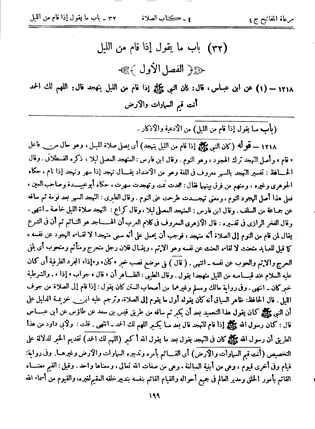 1218- (1) عن ابن عباس قال: ((كان النبي - صلى الله عليه وسلم - إذا قام من الليل يتهجد قال: اللهم لك الحمد أنت