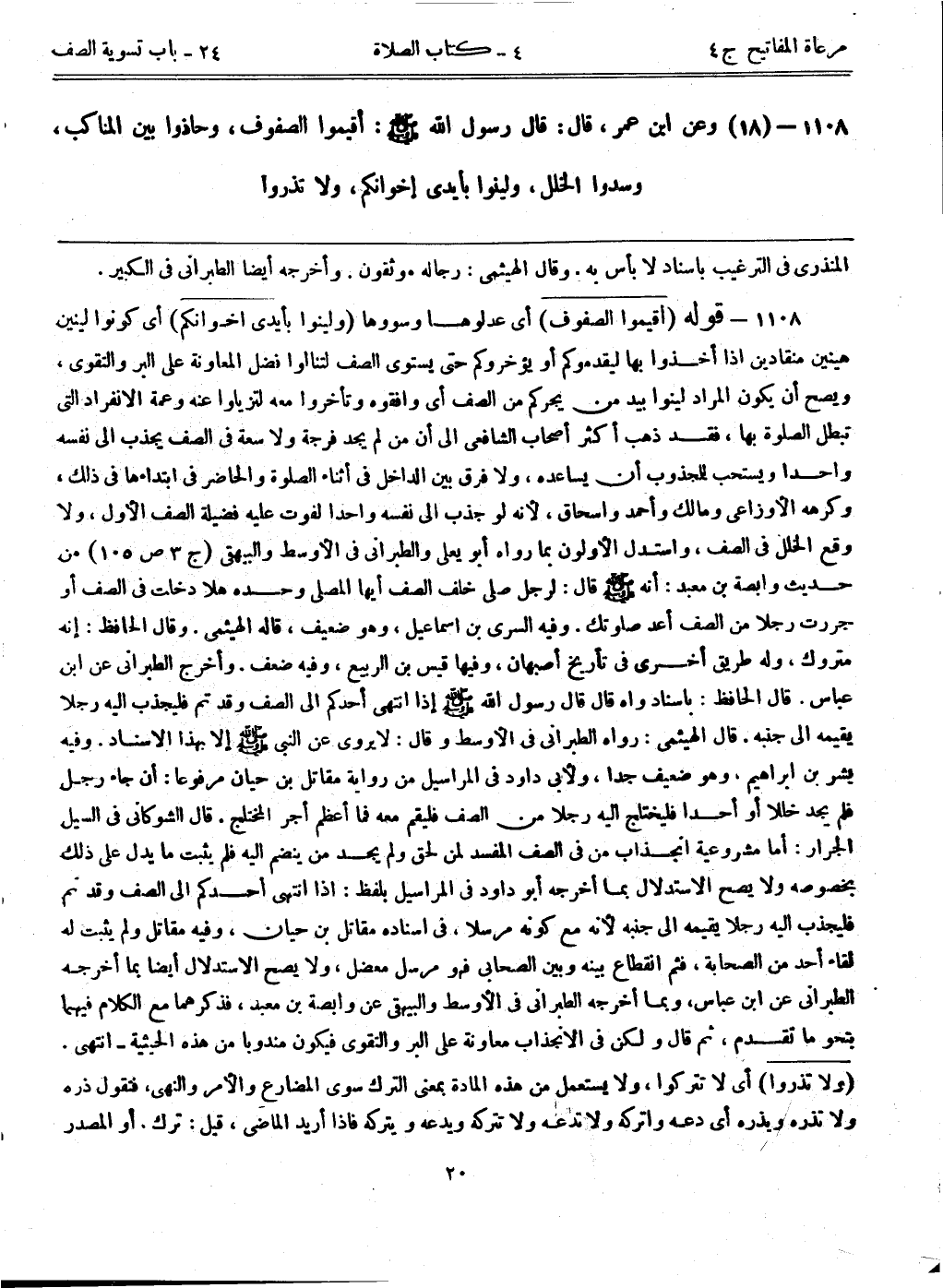 1108- (18) وعن ابن عمر، قال: قال رسول الله - صلى الله عليه وسلم -: ((أقيموا الصفوف، وحاذوا بين المناكب، وسدوا الخلل، ولينوا بأيدي إخوانكم، ولا تذروا