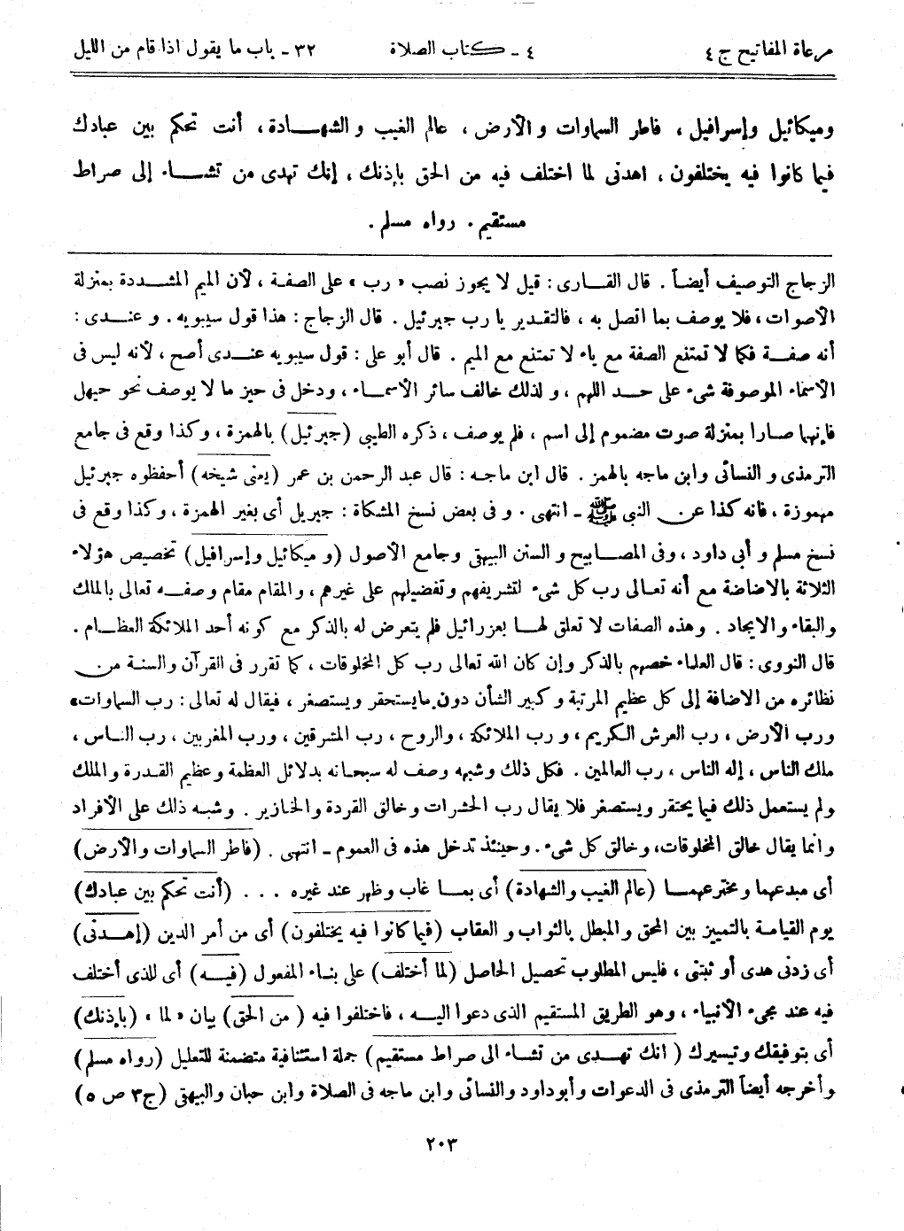 الزجاج التوصيف أيضاً. قال القاري: قيل لا يجوز نصب "رب" على الصفة، لأن الميم المشددة بمنزلة الأصوات، فلا يوصف بما اتصل به، فالتقدير: يا رب جبريل. قال الزجاج: هذا قول سيبوية. وعندي: أنه صفة فكما لا تمتنع الصفة مع ياء لا تمتنع مع الميم. قال أبوعلي: قول سيبوية عندي أصح، لأنه ليس في الأسماء الموصوفة شيء على حد اللهم، ولذلك خالف سائر الأسماء، ودخل في حيز ما لا يوصف، نحو حيهل فإنها صارا بمنزلة صوت مضموم إلى اسم، فلم يوصف، ذكر الطيبي (جبريل) بالهمزة، وكذا وقع في جامع الترمذي والنسائي وابن ماجه بالهمز. قال ابن ماجه: قال عبد الرحمن بن عمر. (يعني شيخه) أحفظوه جبريل مهموزة، فإنه كذا عن النبي - صلى الله عليه وسلم - انتهى. وفي بعض نسخ المشكاة: جبريل أي بغير الهمزة، وكذا وقع في نسخ مسلم وأبي داود، وفي المصابيح والسنن البيهقي وجامع الأصول. (وميكائيل وإسرافيل) تخصيص هؤلاء الثلاثة بالإضافة مع أنه تعالى رب كل شيء لتشريفهم وتفضيلهم على غيرهم، والمقام مقام وصفه تعالى بالملك والبقاء والإيجاد. وهذه الصفات لا تعلق بعزرائيل فلم يتعرض له بالذكر مع كونه أحد الملائكة العظام. قال النووي: قال العلماء خصهم بالذكر وإن كان الله تعالى رب كل مخلوقات، كما تقرر في القرآن والسنة من نظائره من الإضافة إلى كل عظيم المرتبة وكبير الشأن دون ما يستحقر ويستصغر، فيقال له تعالى: {رب السماوات ورب الأرض، رب العرش الكريم، ورب الملائكة، والروح، رب المشرقين، ورب المغربين، رب الناس، ملك الناس، إله الناس، رب العالمين} . فكل ذلك وشبهة وصف له سبحانه بدلائل العظمة وعظيم القدرة والملك ولم يستعمل ذلك فيما يحتقر ويستصغر فلا يقال رب الحشرات وخالق القردة والخنازير. وشبه ذلك على الأفراد وإنما يقال خالق المخلوقات، وخالق كل شيء. وحينئذٍ تدخل هذه في العموم- انتهى. (فاطر السماوات والأرض) أي مبدعهما ومخترعهما. (عالم الغيب والشهادة) أي بما غاب وظهر عند غيره. . (أنت تحكم بين عبادك) يوم القيامة بالتمييز بين المحق والمبطل بالثواب والعقاب. (فيما كانوا فيه يختلفون) أي من أمر الدين. (اهدني) أي زدني هدى أو ثبتني، فليس المطلوب تحصيل الحاصل. (لما اختلف) على بناء المفعول. (فيه) أي للذي اختلف فيه عند مجيء الأنبياء، وهو الطريق المستقيم الذي دعوا إليه، فاختلفوا فيه. (من الحق) بيان لما". (بإذنك) أي بتوفيقك وتيسيرك. (إنك تهدي من تشاء إلى صراط مستقيم) جملة استئنافية متضمنة للتعليل. (رواه مسلم) وأخرجه أيضاً الترمذي في الدعوات وأبوداود والنسائي وابن ماجه في الصلاة وابن حبان والبيهقي (ج3 ص5) .