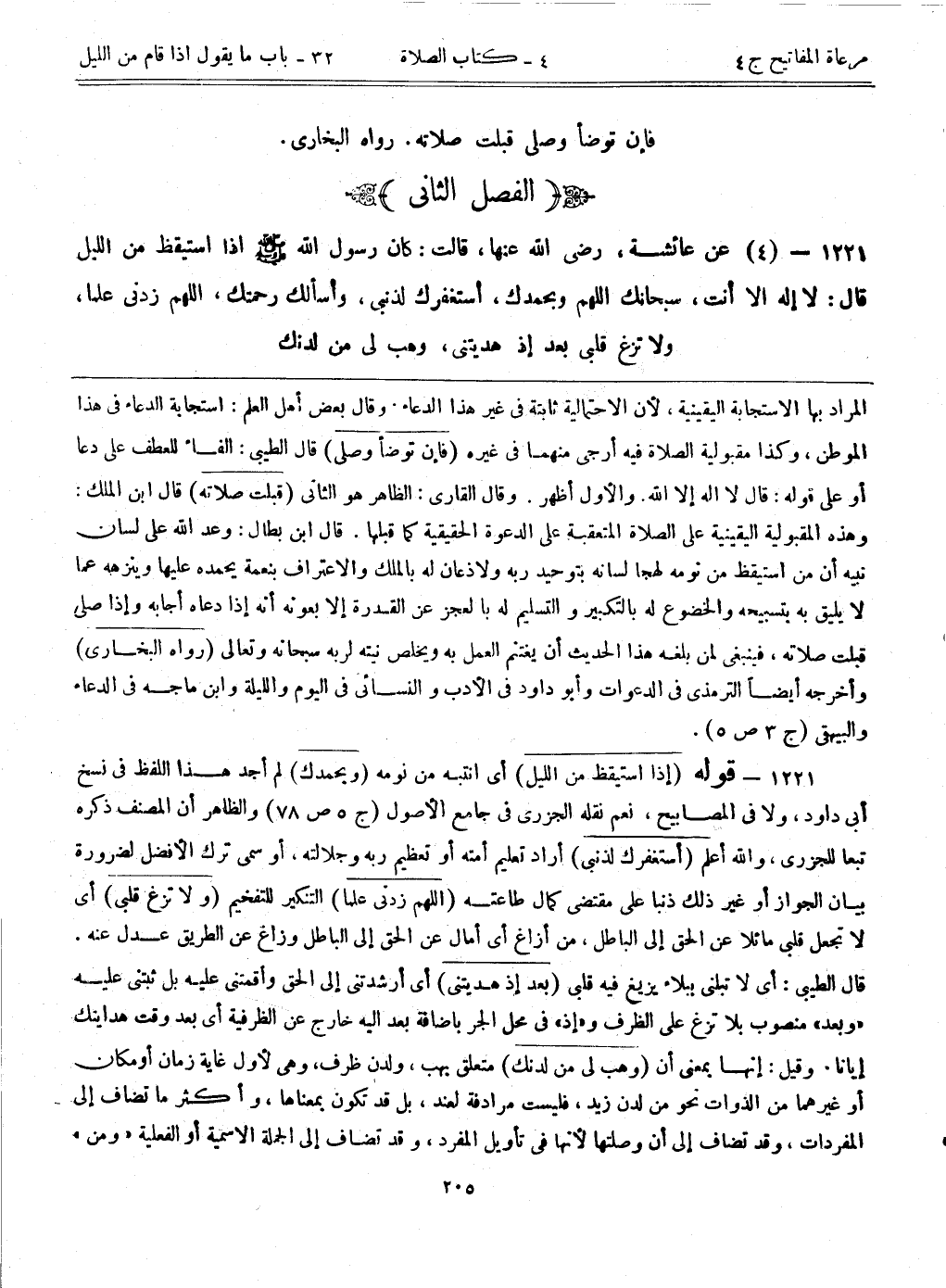 1221- قوله: (إذا استيقظ من الليل) أي انتبه من نومه. (وبحمدك) لم أجد هذا اللفظ في نسخ أبي داود، ولا في المصابيح، نعم نقله الجزري في جامع الأصول (ج5 ص78) والظاهر أن المصنف ذكره تبعاً للجزري، والله أعلم. (أستغفرك ذنبي) أراد تعليم أمته أو تعظيم ربه وجلالته، أو سمي ترك الأفضل لضرورة بيان الجواز أو غير ذلك ذنباً على مقتضى كمال طاعته. (اللهم زدني علما) التنكير للتفخيم. (ولا تزغ قلبي) أي لا تجعل قلبي مائلاً عن الحق إلى الباطل، من أزاغ أي أمال عن الحق إلى الباطل وزاغ عن الطريق عدل عنه. قال الطيبي: أي لا تبلني ببلاء يزيغ فيه قلبي. (بعد إذا هديتني) أي أرشدتني إلى الحق وأقمتني عليه بل ثبتني عليه، "وبعد" منصوب بلا تزغ على الظرف، و"إذ" في محل بإضافة بعد إليه خارج عن الظرفية، أي بعد وقت هدايتك إيانا. وقيل: إنها بمعنى أن. (وهب لي من لدنك) متعلق بهب، ولدن ظرف، وهي لأول غاية زمان أو مكان أو غيرهما من الذوات نحو من لدن زيد، فليست مرادفة لعند، بل قد تكون بمعناها، وأكثر ما تضاف إلى المفردات، وقد تضاف إلى أن وصلتها لأنها في تأويل المفرد، وقد تضاف إلى الجملة الاسمية أو الفعلية "ومن"