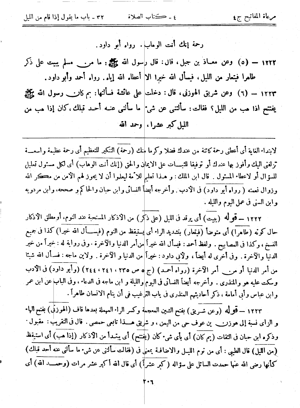 1223- قوله: (وعن شريق) بفتح الشين المعجمة وكسر الراء المهملة بعدها قاف. (الهوزني) بفتح الهاء والزاي نسبة إلى هوزن بن عوف حي من اليمن، وشريق هذا تابعي حمصي. قال في التقريب: مقبول. وذكره ابن حبان في الثقات. (بم كان) أي بأي شيء كان. (يفتتح) أي يبتدأ من الأذكار. (إذا هب) أي استيقظ. (من الليل) قال الطيبي: أي من نوم الليل والإضافة بمعنى في. (فقالت سألتني عن شيء ما سألني عنه أحد قبلك) كأنها رضي الله عنها حمدت السائل على سؤاله. (كبر عشراً) أي قال الله أكبر عشر مرات. (وحمد الله عشراً) أي