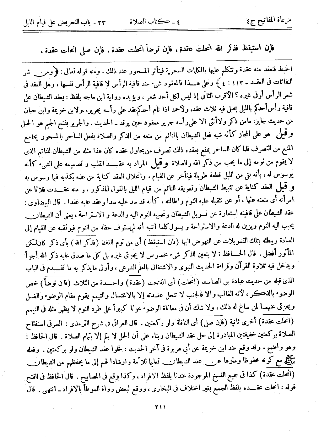 الخيط فتعقد منه عقدة، وتتكلم عليها بالكلمات السحرية، فيتأثر المسحور عند ذلك، ومنه قوله تعالى. {ومن شر النفاثات في العقد} [4:113] وعلى هذا فالمعقود شيء عند قافية الرأس لا قافية نفسها، وهل العقد في شعر الرأس أو في غيره؟ الأقرب الثاني إذ ليس لكل أحد شعر، ويؤيده رواية ابن ماجه بلفظ: يعقد الشيطان على قافية رأس أحدكم بالليل بحبل فيه ثلاث عقد، ولأحمد: إذا نام أحدكم عقد على رأسه بجرير، ولابن خزيمة وابن حبان من حديث جابر: ما من ذكر ولا أنثى إلا على رأسه جرير معقود حين يرقد-الحديث. والجرير بفتح الجيم هو الحبل وقيل: هو على المجاز كأنه شبه فعل الشيطان بالنائم من منعه من الذكر والصلاة بفعل الساحر بالمسحور بجامع المنع من التصرف، فلما كان الساحر يمنع بعقده ذلك تصرف من يحاول عقده كان هذا مثله من الشيطان للنائم الذي لا يقوم من نومه إلى ما يحب من ذكر الله والصلاة، وقيل: المراد به عقد القلب وتصميمه على الشيء كأنه يوسوس له، بأنه بقي من الليل قطعة طويلة فيتأخر عن القيام، وانحلال العقد كناية عن علمه بكذبه فيما وسوس به. وقيل: العقد كناية عن تثبيط الشيطان وتعويقه للنائم من قيام الليل بالقول المذكور، ومنه عقدت فلانًا عن امرأته أي منعته عنها، أو عن تثقيله عليه النوم وإطالته، كأنه قد سد عليه سداً وعقد عليه عقداً. قال البيضاوي: عقد الشيطان على قافيته استعارة عن تسويل الشيطان وتحبيبه النوم إليه والدعة والاستراحة، يعني أن الشيطان يحبب إليه النوم ويزين له الدعة والاستراحة، ويسول كلما انتبه أنه لم يستوف حظه من النوم، فيوثقه عن القيام إلى العبادة ويبطئه بتلك التسويلات عن النهوض إليها. (فإن استيقظ) أي من نوم الغفلة. (فذكر الله) بأي ذكر كان، لكن المأثور أفضل. قال الحافظ: لا يتعين للذكر شيء مخصوص لا يجزئ غيره بل كل ما صدق عليه ذكر الله أجزأ ويدخل فيه تلاوة القرآن وقراءة الحديث النبوي والاشتغال بالعلم الشرعي، وأولى ما يذكر به ما تقدم في الباب الذي قبله من حديث عبادة بن الصامت. (انحلت) أي انفتحت. (عقدة) واحدة من الثلاث. (فان توضأ) خص الوضوء بالذكر، لأنه الغالب، وإلا فالجنب لا تنحل عقدته إلا بالاغتسال والتيمم، يقوم مقام الوضوء والغسل، ويجزئ عنهما لمن ساغ له ذلك، ولا شك أن في معاناة الوضوء عوناً كبيراً على طرد النوم لا يظهر مثله في التيمم. (انحلت عقدة) أخرى ثانية. (فإن صلى) أي النافلة ولو ركعتين. قال العراقي في شرح الترمذي: السر في استفتاح الصلاة بركعتين خفيفتين المبادرة إلى حل عقد الشيطان، وبناه على أن الحل لا يتم إلا بتمام الصلاة. قال الحافظ: وهو واضح، وقد وقع عند ابن خزيمة عن أبي هريرة في آخر الحديث: فحلوا عقد الشيطان ولو بركعتين. وفعله - صلى الله عليه وسلم - مع كونه محفوظاً ومنزهاً عن عقد الشيطان تعليماً للأمة وإرشاداً لهم إلى ما يحفظهم من الشيطان. (انحلت عقدة) كذا في جميع النسخ الموجودة عندنا بلفظ الإفراد، وكذا وقع في المصابيح. قال الحافظ في الفتح قوله: انحلت عقده بلفظ الجمع بغير اختلاف في البخاري، ووقع لبعض رواة الموطأ بالإفراد-انتهى. قال
