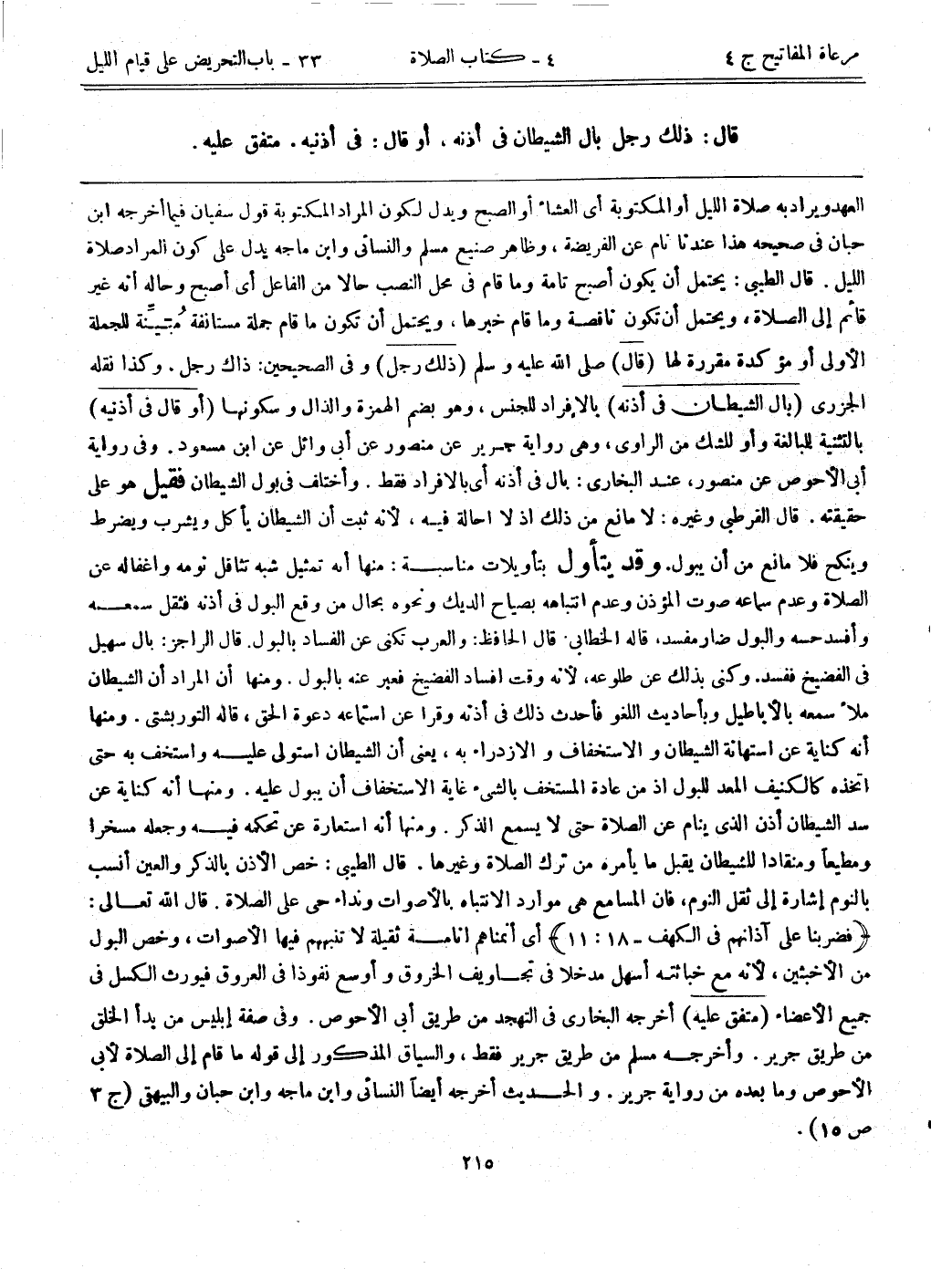 قال: ذلك رجل بال الشيطان في أذنه، أو قال: في أذنيه)) متفق عليه.