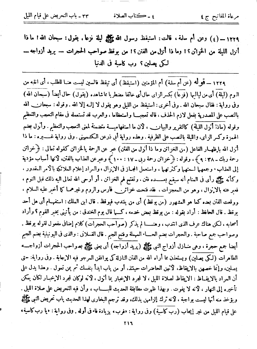 1229- قوله: (عن أم سلمة) أم المؤمنين. (استيقظ) أي تيقظ فالسين ليست هنا للطلب، أي انتبه من النوم. (ليلة) أي من لياليها. (فزعاً) بكسر الزاى حال أي خائفاً مضطرباً مما شاهده. (يقول) حال أيضاً. (سبحان الله) وفي رواية: فقال سبحان الله. وفي أخرى: استيقظ من الليل وهو يقول: لا إله إلا الله. وقوله: سبحان الله بالنصب على المصدرية بفعل لازم الحذف، قاله تعجباً واستعظاماً، والعرب قد تستعمله في مقام التعجب والتعظيم. وقوله: (ماذا أنزل الليلة) كالتقرير والبيان، لأن ما استفهامية متضمنة لمعنى التعجب والتعظيم. وأنزل بضم الهمزة وكسر الزاي، والليلة بالنصب على الظرفية. وهذه رواية أبي ذر عن الكشمهيني. وفي رواية غيره: ماذا أنزل الله بإظهار الفاعل. (من الخزائن وماذا أنزل من الفتن) عبر عن الرحمة بالخزائن كقوله تعالى. {خزائن رحمة ربك} [9:38] وقوله: {خزائن رحمة ربي} [100:17] وعبر عن العذاب بالفتن، لأنها أسباب مؤدية إلى العذاب، وجمعهما لسعتهما وكثرتهما، واستعمل المجاز في الإنزال، والمراد إعلام الملائكة بالأمر المقدور، وكأنه - صلى الله عليه وسلم - رأى في المنام أنه سيقع بعده فتن. وتفتح لهم الخزائن، أو أوحى الله تعالى إليه ذلك قبل النوم، فعبر عنه بالإنزال، وهو من المعجزات، فقد فتحت خزائن فارس والروم وغيرهما كما أخبر عليه السلام، ووقعت الفتن بعده كما هو المشهور. (من يوقظ) أي من ينتدب فيوقظ. قال ابن الملك: استفهام أي هل أحد يوقظ؟ قال الحافظ: أراد بقوله: من يوقظ بعض خدمه، كما قال يوم الخندق: من يأتيني بخبر القوم؟ وأراد أصحابه، لكن هناك عرف الذي انتدب، وهنا لم يذكر (صواحب الحجرات) كلام إضافي مفعول لقوله: يوقظ. وصواحب جمع صاحبة. والحجرات بضم الحاء المهملة وفتح الجيم. قال القسطلاني: والذي في اليونينية بضم الجيم أيضاً جمع حجرة، وهي منازل أزواج النبي - صلى الله عليه وسلم -. (يريد أزواجه) أي يعني - صلى الله عليه وسلم - بصواحب الحجرات أزواجه الطاهرات. (لكي يصلين) ويستعذن مما أراه الله من الفتن النازلة كي يوافقن المرجو فيه الإجابة. وفي رواية: حتى يصلين، وإنما خصهن بالإيقاظ، لأنهن الحاضرات حينئذٍ، أومن باب: إبدأ بنفسك ثم بمن تعول. وهذا يدل على أن المراد بالايقاظ: الإيقاظ لصلاة الليل، لا لمجرد الإخبار بما أنزل، لأنه لو كان لمجرد الإخبار لكان يمكن تأخيره إلى النهار، لأنه لا يفوت. وبهذا ظهرت مطابقة الحديث للباب، وأن فيه التحريض على صلاة الليل. ويؤخذ منه أنها ليست بواجبة، لأنه ترك إلزامهن بذلك، وقد ترجم البخاري لهذا الحديث: باب تحريض النبي - صلى الله عليه وسلم - على قيام الليل من غير إيجاب. (رب كاسية) وفي رواية: "فرب " زيادة فاء في أوله. وفي رواية "يا رب كاسية"