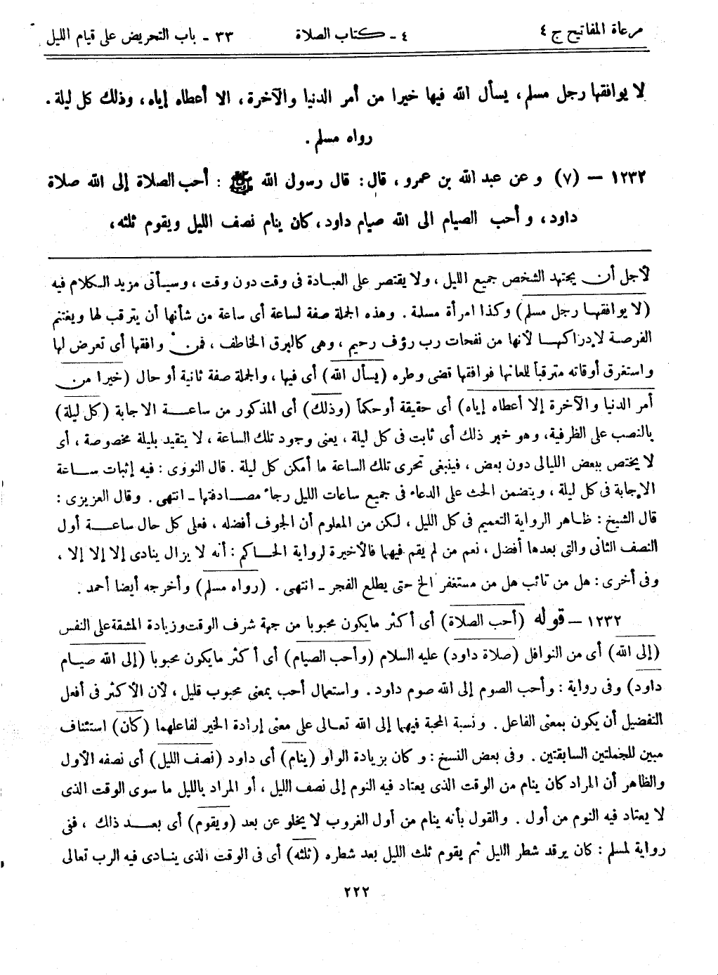 1232- (7) وعن عبد الله بن عمرو، قال: قال رسول الله - صلى الله عليه وسلم -: ((أحب الصلاة إلى الله صلاة داود، وأحب الصيام إلى الله صيام داود، كان ينام نصف الليل ويقوم ثلثه،