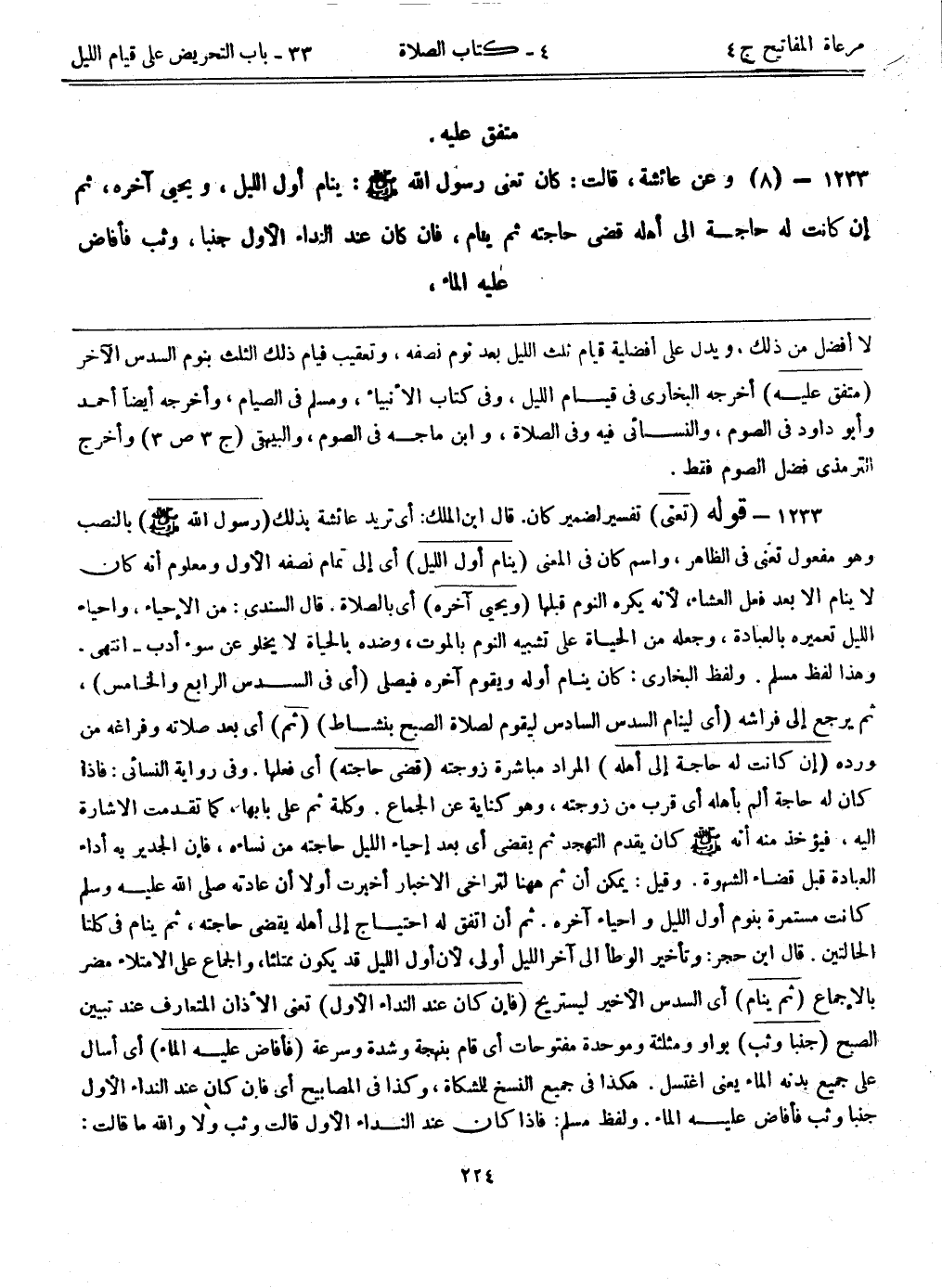 1233- قوله: (تعني) تفسير لضمير كان. قال ابن الملك: أي تريد عائشة بذلك. (رسول الله - صلى الله عليه وسلم -) بالنصب وهو مفعول تعني في الظاهر، واسم كان في المعنى. (ينام أول الليل) أي إلى تمام نصفه الأول ومعلوم أنه كان لا ينام إلا بعد فعل العشاء"؛ لأنه يكره النوم قبلها. (ويحيي أخره) أي بالصلاة. قال السندي: من الإحياء، وإحياء الليل تعميره بالعبادة، وجعله من الحياة على تشبيه النوم بالموت، وضده بالحياة لا يخلو عن سوء أدب- انتهى. وهذا لفظ مسلم. ولفظ البخاري: كان ينام أوله ويقوم آخره فيصلي. (أي في السدس الرابع والخامس) ، ثم يرجع إلى فراشه. (أي لينام السدس السادس ليقوم لصلاة الصبح بنشاط) . (ثم) أي بعد صلاته وفراغه من ورده. (إن كانت له حاجة إلى أهله) المراد مباشرة زوجته. (قضى حاجته) أي فعلها. وفي رواية النسائي: فإذا كان له حاجة ألمّ بأهله أي قرب من زوجته، وهو كناية عن الجماع. وكلمة ثم بابها، كما تقدمت الإشارة إليه، فيؤخذ منه أنه - صلى الله عليه وسلم - كان يقدم التهجد ثم يقضي بعد إحياء الليل حاجته من نساءه، فإن الجدير به أداء العبادة قبل قضاء الشهوة. وقيل: يمكن أن ثم ههنا لتراخي الإخبار أخبرت أولاً أن عادته - صلى الله عليه وسلم - كانت مستمرة بنوم أول الليل وإحياء أخره. ثم أن اتفق له احتياج إلى أهله يقضي حاجته، ثم ينام في كلتا الحالتين. قال ابن حجر: وتأخير الوطأ إلى آخر الليل أولى؛ لأن أول الليل قد يكون ممتلئاً، والجماع على الامتلاء مضر بالإجماع. (ثم ينام) أي السدس الأخير ليستريح. (فإن كان عند النداء الأول) تعني الأذان المتعارف عند تبيين الصبح. (جنباً وثب) بواو ومثلثة وموحدة مفتوحات أي قام بنهجه وشدة وسرعة. (فأفاض عليه الماء) أي أسال على جميع بدنه الماء يعني اغتسل. هكذا في جميع النسخ للمشكاة، وكذا في المصابيح أي فإن عند النداء الأول جنباً وثب فأفاض عليه الماء. ولفظ مسلم: فإذا كانت عند النداء الأول قالت وثب ولا والله ما قالت: