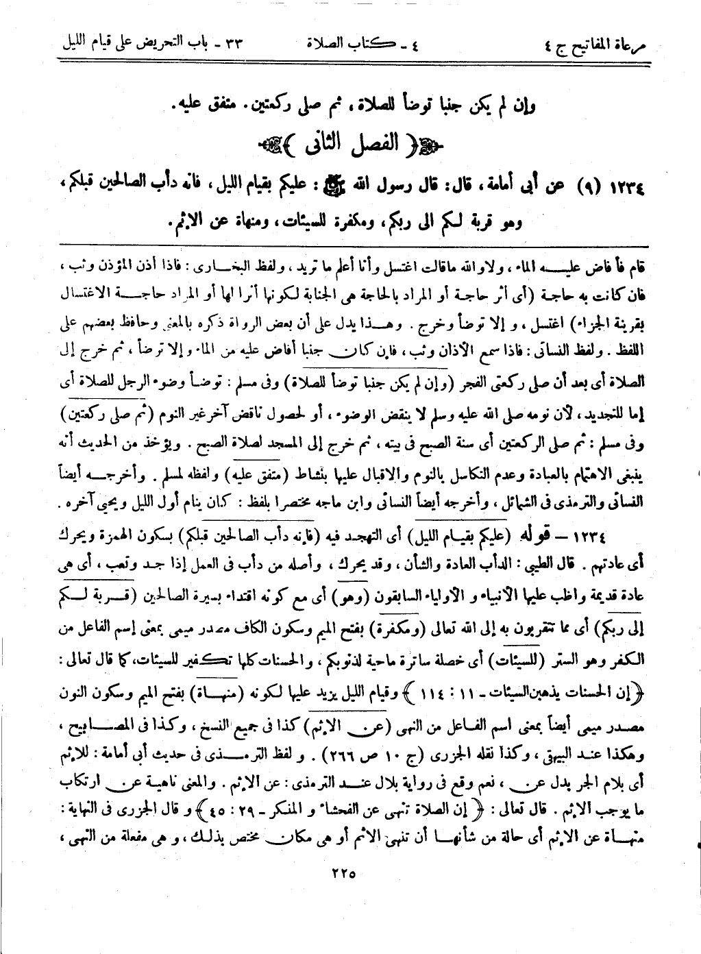 1234- قوله: (عليكم بقيام الليل) أي التهجد فيه. (فإنه دأب الصالحين قبلكم) بسكون الهمزة ويحرك أي عادتهم. قال الطيبي: الدأب العادة والشأن، وقد يحرك، وأصله من دأب في العمل إذا جد وتعب، أي هي عادة قديمة واظب عليها الأنبياء والأولياء السابقون. (وهو) أي مع كونه إقتداء بسيرة الصالحين. (قربة لكم إلى ربكم) أي مما تتقربون به إلى الله تعالى. (ومكفرة) بفتح الميم وسكون القاف مصدر ميمي بمعنى اسم فاعل من الكفر وهو الستر. (للسيئات) أي خصلة ساترة ماحية لذنوبكم، والحسنات كلها تكفير للسيئات، كما قال تعالى:. {إن الحسنات يذهبن السيئات} [11: 114] ، وقيام الليل يزيد عليها لكونه (منهاة) بفتح الميم وسكون النون مصدر ميمي أيضاً بمعنى اسم فاعل من النهي. (عن الإثم) كذا في جميع النسخ، وكذا في المصابيح، وهكذا عند البيهقي، وكذا نقله الجزري (ج10 ص266) . ولفظ الترمذي في حديث أبي أمامة: للإثم أي بلام الجر بدل عن، نعم وقع في رواية بلال عند الترمذي: عن الإثم. والمعنى ناهية عن ارتكاب ما يوجب الإثم. قال تعالى:. {إن الصلاة تنهى عن الفحشاء والمنكر} [29: 45] وقال الجزري في النهاية: منهاة عن الإثم أي حالة من شأنها أن تنهى الإثم أو هي مكان مختص بذلك، وهي مفعلة من النهي،