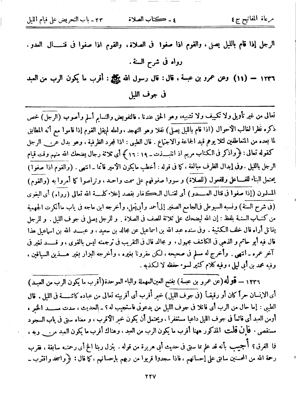 1236- قوله: (عن عمرو بن عبسة) بفتح العين المهملة والباء الموحدة. (أقرب ما يكون الرب من العبد) أي الإنسان حراً كان أو رقيقاً. (في جوف الليل) خبر أقرب أي أقربيته تعالى من عباده كائنة في الليل. قال الطيبي: إما حال من الرب أي قائلاً في جوف الليل من يدعوني فاستجيب له؟ - الحديث، سدت مسد الخبر، أو من العبد أي قائماً في جوف الليل داعياً مستغفراً، ويحتمل أن يكون خبر الأقرب، ومعناه سبق في باب السجود مستقصى. فإن قلت المذكور ههنا أقرب ما يكون الرب من العبد، وهناك أقرب ما يكون العبد من ربه، فما الفرق؟ أجيب بأنه قد علم مما سبق في حديث أبي هريرة من قوله. ينزل ربنا الخ أي رحمته سابقة، فقرب رحمة الله من المحسنين سابق على إحسانهم، فإذا سجدوا قربوا من ربهم بإحسانهم، كما قال تعالى: {واسجد واقترب} [96: 19]