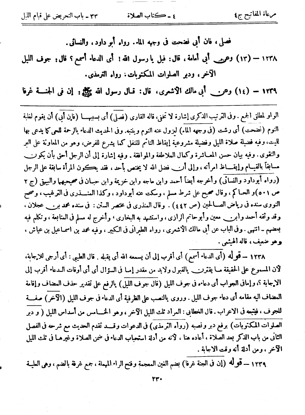 1238- قوله: (أيّ الدعاء أسمع) أي أقرب إلى أن يسمعه الله أي يقبله. قال الطيبي: أي أرجى للإجابة؛ لأن المسموع على الحقيقة ما يقترن بالقبول ولا بد من مقدر، إما في السؤال أي، أي أوقات الدعاء أقرب إلى الإجابة؟ وإما في الجواب أي دعاءه في جوف الليل. (قال جوف الليل) بالرفع على تقدير حذف المضاف وإقامة المضاف إليه مقامه، أي دعاء جوف الليل. وروي بالنصب على الظرفية أي الدعاء في جوف الليل. (الآخر) صفة للجوف، فيتبعه في الإعراب. قال الخطابي: المراد ثلث الليل الآخر، وهو الخامس من أسداس الليل. (ودبر الصلوات المكتوبات) برفع دبر ونصبه. (رواه الترمذي) في الدعوات. وقد تقدم الحديث مع شرحه في الفصل الثاني من باب الذكر بعد الصلاة، أعاده هنا؛ لأنه من أدلة استحباب الدعاء في ضمن الصلاة وغيرها في ثلث الليل الآخر، ومن أدلة أنه وقت الإجابة.