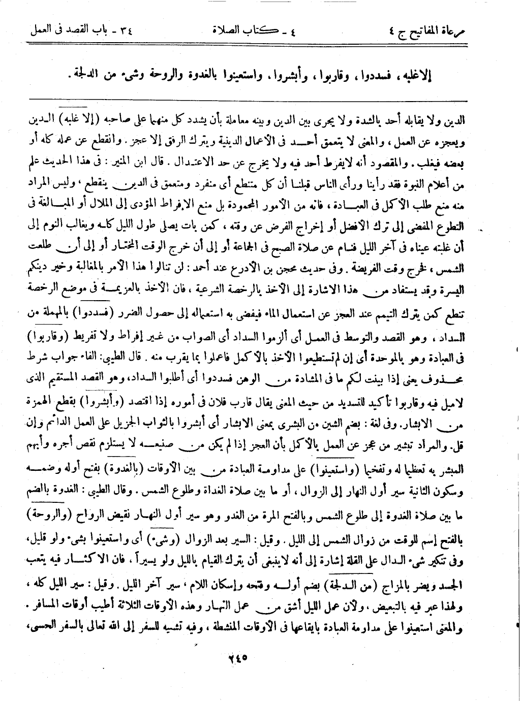 إلا غلبة، فسددوا، وأبشروا، واستعينوا بالغدوة والروحة وشيء من الدلجة)) .