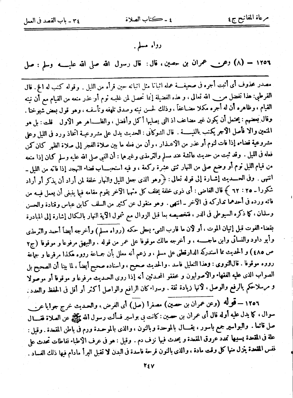 1256- (8) وعن عمران بن حصين، قال: قال رسول الله - صلى الله عليه وسلم -: ((صل