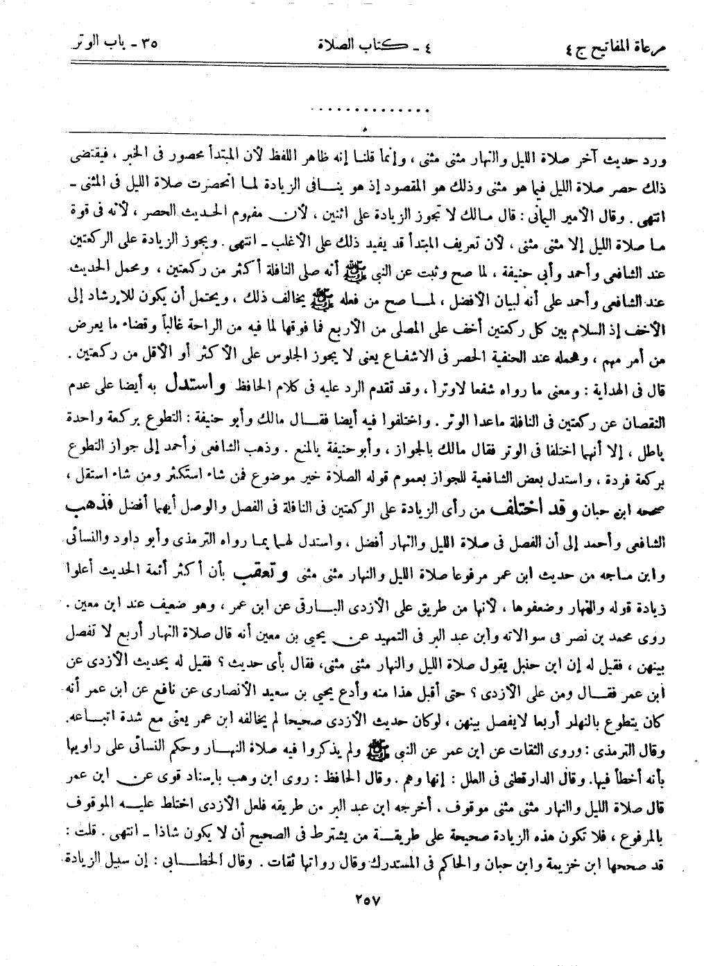 ورد حديث آخر صلاة الليل والنهار مثنى مثنى، وإنما قلنا إنه ظاهر اللفظ؛ لأن المبتدأ محصور في الخبر، فيقتضي ذلك حصر صلاة الليل فيما هو مثنى، وذلك هو المقصود إذ هو ينافي الزيادة لما انحصرت صلاة الليل في المثنى- انتهى. وقال الأمير اليماني: قال مالك لا تجوز الزيادة على اثنين؛ لأن مفهوم الحديث الحصر؛ لأنه في قوة ما صلاة الليل إلا مثنى مثنى؛ لأن تعريف المبتدأ قد يفيد ذلك على الأغلب- انتهى. ويجوز الزيادة على الركعتين عند الشافعي وأحمد وأبي حنيفة، لما صح وثبت عن النبي - صلى الله عليه وسلم - أنه صلى النافلة أكثر من ركعتين، ومحمل الحديث عند الشافعي وأحمد على أنه لبيان الأفضل، لما صح من فعله - صلى الله عليه وسلم - يخالف ذلك، ويحتمل أن يكون للإرشاد إلى الأخف، إذ السلام بين كل ركعتين أخف على المصلي من الأربع فما فوقها لما فيه الراحة غالباً وقضاء ما يعرض من أمر مهم، ومحمله عند الحنفية الحصر في الإشفاع، يعني لا يجوز الجلوس على الأكثر أو الأقل من ركعتين. قال في الهداية: ومعنى ما رواه شفعاً لا وتراً، وقد تقدم الرد عليه في كلام الحافظ. واستدل به أيضاً على عدم النقصان عن ركعتين في النافلة ما عدا الوتر، واختلفوا فيه أيضاً فقال مالك وأبوحنيفة: التطوع بركعة واحدة باطل، إلا أنهما اختلفا في الوتر فقال مالك بالجواز، وأبوحنيفة بالمنع. وذهب الشافعي وأحمد إلى جواز التطوع بركعة فردة، واستدل بعض الشافعية للجواز بعموم قوله: الصلاة خير موضوع فمن شاء استكثر ومن شاء استقل، صححه ابن حبان وقد اختلف من رأى الزيادة على الركعتين في النافلة في الفصل والوصل أيهما أفضل، فذهب الشافعي وأحمد إلى أن الفصل في صلاة الليل والنهار أفضل، واستدل لهما بما رواه الترمذي وأبوداود والنسائي وابن ماجه من حديث ابن عمر مرفوعاً: صلاة الليل والنهار مثنى مثنى. وتعقب بأن أكثر أئمة الحديث أعلوا زيادة قوله والنهار وضعفوها؛ لأنها من طريق علي الأزدي البارقي عن ابن عمر، وهو ضعيف عند ابن معين. روى محمد بن نصر في سؤالاته وابن عبد البر في التمهيد عن يحيى بن معين أنه قال صلاة النهار أربع لا تفصل بينهن، فقيل له إن ابن حنبل يقول: صلاة الليل والنهار مثنى مثنى، فقال: بأي حديث؟ فقيل له: بحديث الأذري عن ابن عمر، فقال: ومن على الأذري؟ حتى أقبل هذا منه وأدع يحيى بن سعيد الأنصاري عن نافع عن ابن عمر أنه كان يتطوع بالنهار أربعاً لا يفصل بينهن، لو كان حديث الأذري صحيحاً لم يخالفه ابن عمر يعني مع شدة إتباعه. وقال الترمذي: وروى الثقات عن ابن عمر عن النبي - صلى الله عليه وسلم -، ولم يذكروا فيه صلاة النهار وحكم النسائي على راويها بأنه أخطأ فيها. وقال الدارقطني في العلل: إنها وهم. وقال الحافظ: روى ابن وهب بإسناد قوي عن ابن عمر قال: صلاة الليل والنهار مثنى مثنى موقوف. أخرجه ابن عبد البر من طريقة فلعل الأذري اختلط عليه الموقوف بالمرفوع، فلا تكون هذه الزيادة صحيحة على طريقة من يشترط في الصحيح أن لا يكون شاذا- انتهى. قلت: قد صححها ابن خزيمة وابن حبان والحاكم في المستدرك وقال: رواتها ثقات. وقال الخطابي: إن سبيل الزيادة