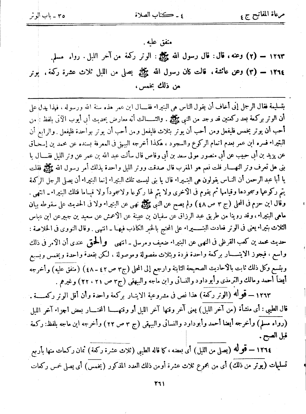 1264- قوله: (يصلي من الليل) أي بعضه، كما قاله الطيبي. (ثلاث عشرة ركعة) ثمان ركعات منها بأربع تسليمات. (يوتر من ذلك) أي من مجموع ثلاث عشرة أو من ذلك العدد المذكور. (بخمس) أي يصلي خمس ركعات