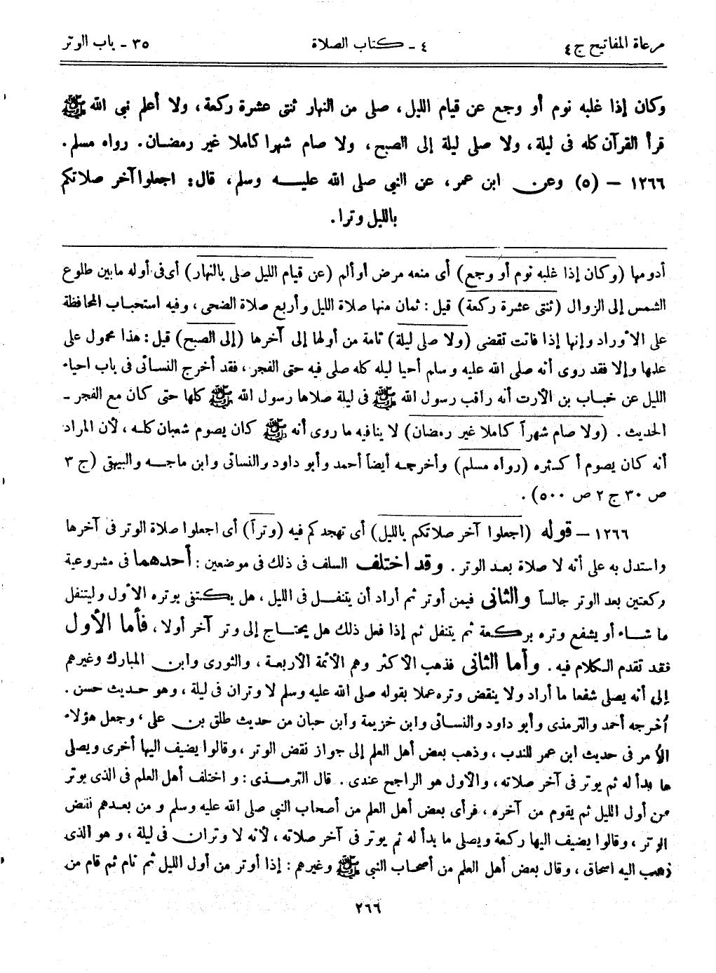 1266- (5) وعن ابن عمر، عن النبي - صلى الله عليه وسلم -، قال: ((اجعلوا آخر صلاتكم بالليل وتراً))