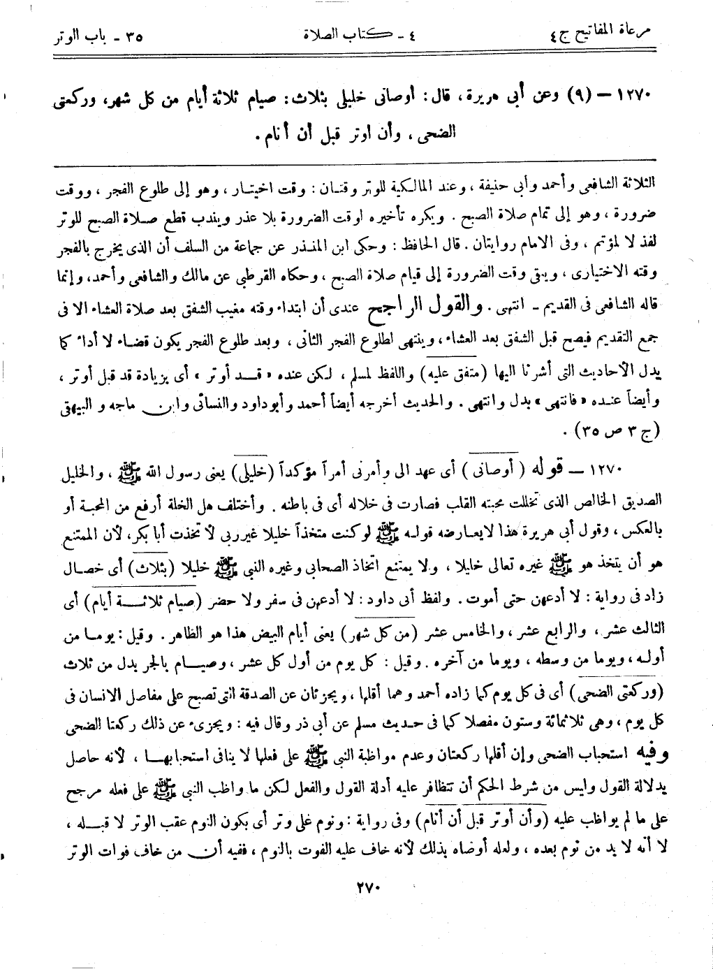 1270- (9) وعن أبي هريرة، قال: ((أوصاني خليلي بثلاث: صيام ثلاثة أيام من كل شهر، وركعتي الضحى، وأن أوتر قبل أن أنام))
