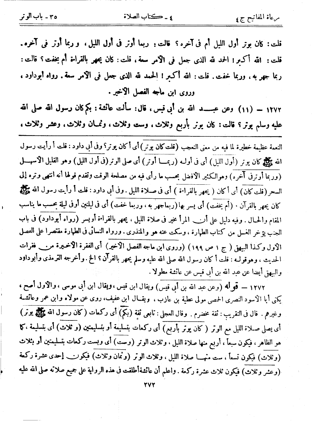 1272- قوله: (وعن عبد الله بن أبي قيس) ويقال ابن قيس، ويقال ابن موسى، والأول أصح، يكنى أبا الأسود النصري الحمصي مولى عطية بن عازب، ويقال ابن عفيف، روى عن مولاه وابن عمر وعائشة وغيرهم. قال في التقريب: ثقة مخضرم. وقال العجلي: تابعي ثقة. (بكم) أي ركعات. (كان رسول الله - صلى الله عليه وسلم - يوتر) أي يصلي صلاة الليل مع الوتر. (كان يوتر بأربع) أي ركعات بتسليمة أو بتسليمتين. (وثلاث) أي بتسليمة، كما هو الظاهر، فيكون سبعاً، أربع منها صلاة الليل، وثلاث الوتر. (وست) أي وبست ركعات بتسليمتين أو بثلاث. (وثلاث) فيكون تسعاً، ست منها صلاة الليل، وثلاث الوتر. (وثمان وثلاث) فيكون إحدى عشرة ركعة. (وعشر وثلاث) فيكون ثلاث عشرة ركعة. واعلم أن عائشة أطلقت في هذه الرواية على جميع صلاته - صلى الله عليه وسلم -