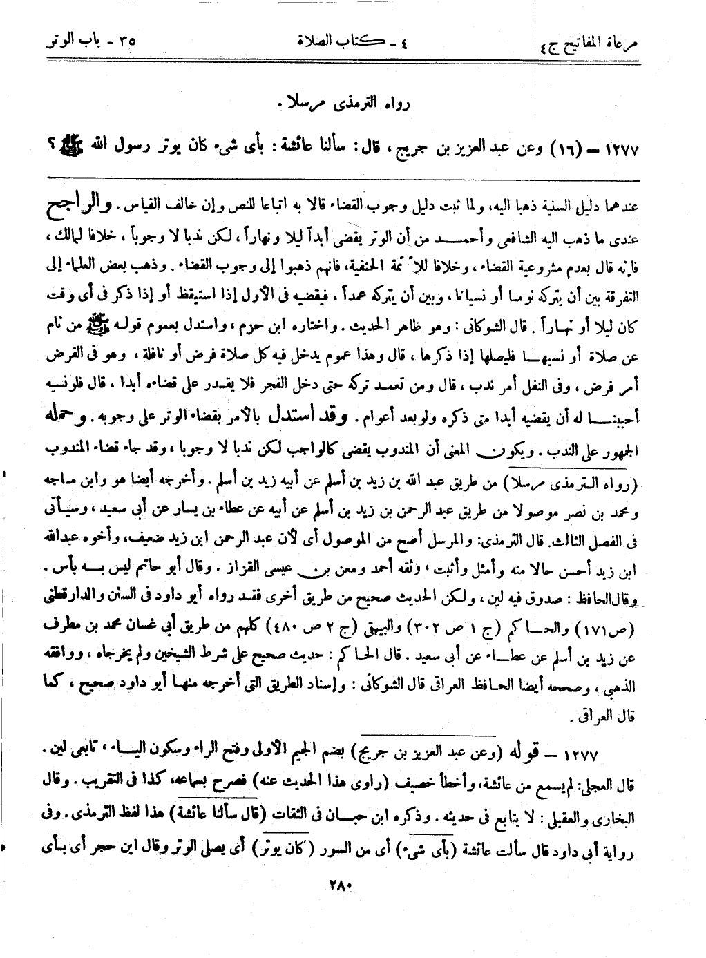 1277- قوله: (وعن بد العزيز بن جريج) بضم الجيم الأولى وفتح الراء وسكون الياء، تابعي لين. قال العجلي: لم يسمع من عائشة، وأخطأ خصيف. (راوي هذا الحديث عنه) فصرح بسماعه، كذا في التقريب. وقال البخاري والعقيلي: لا يتابع في حديثه. وذكره ابن حبان في الثقات. (قال: سألنا عائشة) هذا لفظ الترمذي. وفي رواية أبي داود قال: سألت عائشة. (بأي شيء) أي من السور. (كان يوتر) أي يصلي الوتر وقال ابن حجر أي بأي