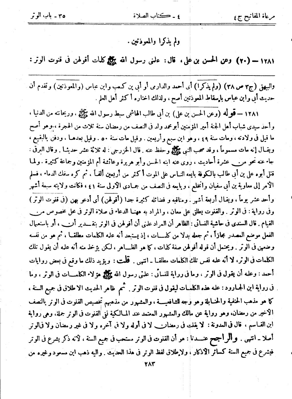 1281- (20) وعن الحسن بن علي، قال: ((علمني رسول الله - صلى الله عليه وسلم - كلمات أقولهن في قنوت الوتر: