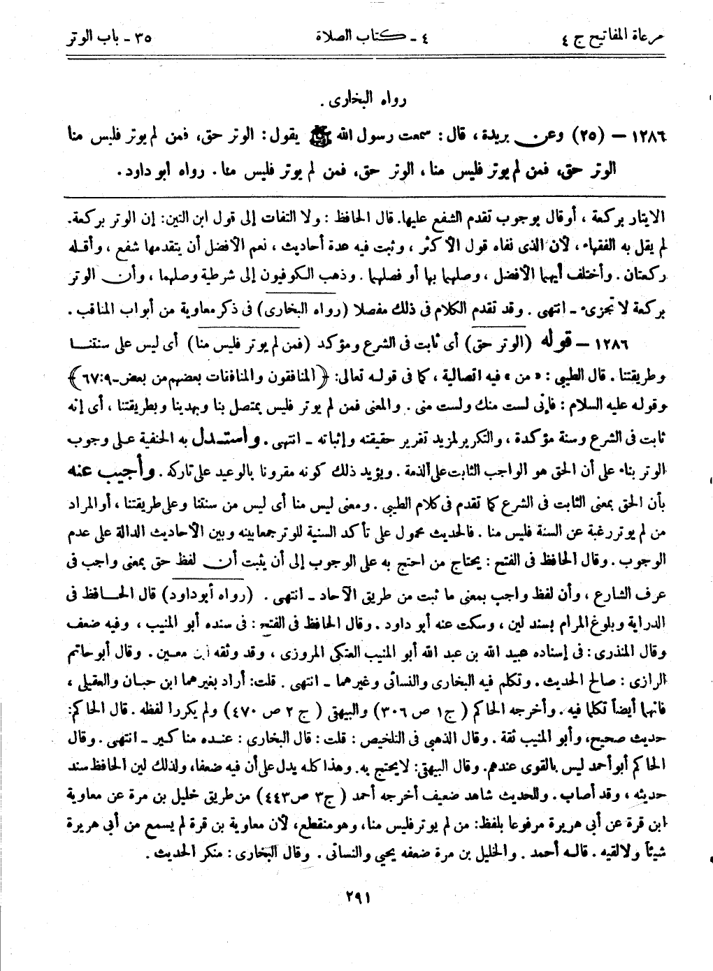 1286- (25) وعن بريدة، قال: قال سمعت رسول الله - صلى الله عليه وسلم - يقول: ((الوتر حق، فمن لم يوتر فليس منا الوتر حق، فمن لم يوتر فليس منا، الوتر حق، فمن لم يوتر فليس منا)) . رواه أبوداود.