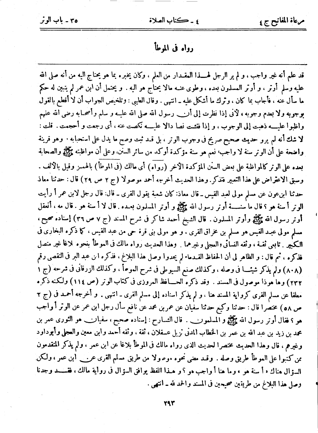 قد علم أنه غير واجب، ولم ير الرجل لهذا المقدار من العلم، وكان يخبره بما هو يحتاج إليه من أنه - صلى الله عليه وسلم - أوتر، وأوتر المسلمون بعده، وطوى عنه ما لا يحتاج هو إليه. ويحتمل أن ابن عمر لم يتبين له حكم ما سأل عنه، فأجاب بما كان، وترك ما أشكل عليه- انتهى. وقال الطيبي: وتلخيص الجواب أن لا أقطع بالقول بوجوبه ولا بعدم وجوبه؛ لأني إذا نظرت إلى أن رسول الله - صلى الله عليه وسلم - وأصحابه رضي الله عنهم واظبوا عليه ذهبت إلى الوجوب، وإذا فتشت نصاً دالاً عليه نكصت عنه، أي رجعت وأحجمت. قلت: لا شك أنه لم يرو حديث صحيح صريح في وجوب الوتر، بل قد ثبت وصح ما يدل على استحبابه. وهو قرينة واضحة على أن الوتر سنة لا واجب، نعم هو سنة مؤكدة أوكد من سائر السنن، وعلى أن مواظبته - صلى الله عليه وسلم - والصحابة بعده على الوتر كالمواظبة على بعض السنن المؤكدة الأخر. (رواه) أي مالك. (في الموطأ) بالهمزة وقيل بالألف. وسبق الاعتراض على هذا التعبير، فتذكر. وهذا الحديث أخرجه أحمد موصولاً (ج2 ص29) قال: حدثنا معاذ حدثنا ابن عون عن مسلم مولى لعبد القيس- قال معاذ: كان شعبة يقول القرى- قال: قال رجل لابن عمر أرأيت الوتر أسنة هو؟ قال ما سنة أوتر رسول الله - صلى الله عليه وسلم - وأوتر المسلمون بعده. قال: لا أسنة هو؟ قال: مه، أتعقل أوتر رسول الله - صلى الله عليه وسلم - وأوتر المسلمون. قال الشيخ أحمد شاكر في شرح المسند (ج7 ص36) : إسناده صحيح، مسلم مولى عبد القيس هو مسلم بن مخراق القرى، وهو مولى بنى قرة حي من عبد القيس، كما ذكره البخاري في الكبير. تابعي ثقة، وثقه النسائي والعجلي وغيرهما. وهذا الحديث رواه مالك في الموطأ بنحوه بلاغاً غير متصل فذكره، ثم قال: والظاهر لي أن الحفاظ القدماء لم يجدوا وصل هذا البلاغ، فذكره ابن عبد البر في التقصي رقم (808) ولم يذكر شيئاً في وصله، وكذلك صنع السيوطي في شرح الموطأ، وكذلك الزرقاني في شرحه (ج1 232) وها هو ذا موصول في المسند. وقد ذكره الحافظ المروزي في كتاب الوتر (ص114) ولكنه ذكره معلقاً عن مسلم القرى كرواية المسند هنا، ولم يذكر إسناده إلى مسلم القرى- انتهى. وأخرجه أحمد في (ج2 ص58) مختصراً قال: حدثنا وكيع حدثنا سفيان عن عمرو بن محمد عن نافع سأل رجل ابن عمر عن الوتر أواجب هو؟ فقال: أوتر رسول الله - صلى الله عليه وسلم - والمسلمون. قال الشارح: إسناده صحيح، سفيان هو الثوري عمر بن محمد بن زيد بن عبد الله بن عمر بن الخطاب المدني نزيل عسقلان، ثقه، وثقه أحمد وابن معين والعجلي وأبوداود وغيرهم، قال: وهذا الحديث مختصراً لحديث الذي رواه مالك في الموطأ بلاغاً عن ابن عمر، ولم يذكر المتقدمون ممن كتبوا على الموطأ طريق وصله. وقد مضى نحوه موصولاً من طريق مسلم القرى عن ابن عمر، ولكن السؤال هناك "أسنة هو" وما هنا أواجب هو؟ وهذا اللفظ يوافق السؤال في رواية مالك، فقد وجدنا وصل هذا البلاغ من طريقتين صحيحين في المسند والحمد لله- انتهى.