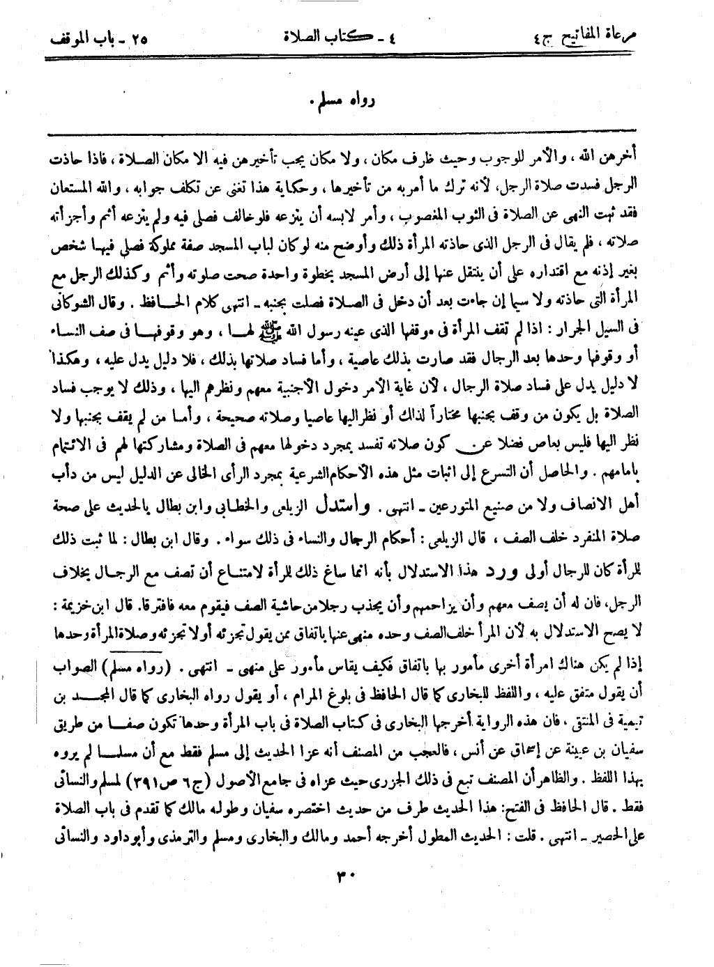 أخرهن الله، والأمر للوجوب وحيث ظرف مكان، ولا مكان يجب تأخيرهن فيه إلا مكان الصلاة، فإذا حاذت الرجل فسدت صلاة الرجل؛ لأنه ترك ما أمر به من تأخيرها، وحكاية هذا تغني عن تكلف جوابه، والله المستعان. فقد ثبت النهى عن الصلاة في الثوب المغصوب، وأمر لابسه أن ينزعه، فلو خالف فصلى فيه ولم ينزعه أثم وأجزأته صلاته، فلم يقال في الرجل الذي حاذته المرأة ذلك وأوضح منه لو كان لباب المسجد صفة مملوكة فصلى فيها شخص بغير إذنه مع اقتداره على أن ينتقل عنها إلى أرض المسجد بخطوة واحدة صحت صلاته وأثم، وكذلك الرجل مع المرأة التي حاذته، ولا سيما إن جاءت بعد أن دخل في الصلاة فصلت بجنبه- انتهى كلام الحافظ. وقال الشوكاني في السيل الجرار: إذا لم تقف المرأة في موقفها الذي عينه رسول الله - صلى الله عليه وسلم - لها، وهو وقوفها في صف النساء أو وقوفها وحدها بعد الرجال فقد صارت بذلك عاصية، وأما فساد صلاتها بذلك، فلا دليل يدل عليه، وهكذا لا دليل يدل على فساد صلاة الرجال؛ لأن غاية الأمر دخول الأجنبية معهم ونظرهم إليها، وذلك لا يوجب فساد الصلاة، بل يكون من وقف بجنبها مختاراً لذلك، أو نظر إليها عاصياً، وصلاته صحيحة، وأما من لم يقف بجنبها ولا نظر إليها فليس بعاص فضلاً عن كون صلاته تفسد بمجرد دخولها معهم في الصلاة ومشاركتها لهم في الائتمام بإمامهم. والحاصل أن التسرع إلى إثبات مثل هذه الأحكام الشرعية بمجرد الرأي الخالي عن الدليل ليس من دأب أهل الأنصاف ولا من صنيع المتورعين - انتهى. واستدل الزيلعي والخطابي وابن بطال بالحديث على صحة صلاة المنفرد خلف الصف، قال الزيلعي: أحكام الرجال والنساء في ذلك سواء. وقال ابن بطال: لما ثبت ذلك للمرأة كان للرجال أولى، ورد هذا الاستدلال بأنه إنما ساغ ذلك للمرأة لامتناع أن تصف مع الرجال بخلاف الرجل، فان له أن يصف معهم وأن يزاحمهم وأن يجذب رجلاً من حاشية الصف فيقوم معه فافترقا. قال ابن خزيمة: لا يصح الاستدلال به؛ لأن المرأة خلف الصف وحده منهي عنها باتفاق ممن يقول تجزئه أو لا تجزئه، وصلاة المرأة وحدها إذا لم يكن هناك امرأة أخرى مأمور بها، فكيف يقاس مأمور على منهي - انتهى. (رواه مسلم) . الصواب أن يقول متفق عليه، واللفظ للبخاري كما قال الحافظ في بلوغ المرام، أو يقول رواه البخاري كما قال المجد بن تيمية في المنتقى، فإن هذه الرواية أخرجها البخاري في كتاب الصلاة في باب المرأة وحدها تكون صفاً من طريق سفيان بن عيينة عن إسحاق عن أنس، فالعجب من المصنف أنه عزا الحديث إلى مسلم فقط مع أن مسلماً لم يروه بهذا اللفظ. والظاهر أن المصنف تبع في ذلك الجزري حيث عزاه في جامع الأصول (ج6:ص391) لمسلم والنسائي فقط. قال الحافظ في الفتح: هذا الحديث طرف من حديث اختصره سفيان، وطوله مالك كما تقدم في باب الصلاة على الحصير - انتهى. قلت: الحديث المطول أخرجه أحمد ومالك والبخاري ومسلم والترمذي وأبوداود والنسائي