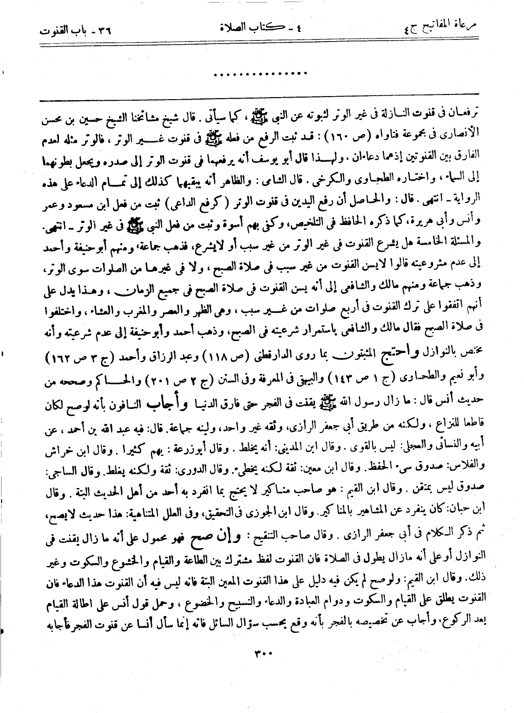 ترفعان في قنوت النازلة في غير الوتر لثبوته عن النبي - صلى الله عليه وسلم -، كما سيأتي. قال شيخ مشائخنا الشيخ حسين بن محسن الأنصاري في مجموعة فتاواه (ص160) : قد ثبت الرفع من فعله - صلى الله عليه وسلم - في قنوت غير الوتر، فالوتر مثله لعدم الفارق بين القنوتين إذ هما دعاءان، ولهذا قال أبويوسف أنه يرفعهما في قنوت الوتر إلى صدره ويجعل بطونهما إلى السماء، واختاره الطحاوي والكرخي. قال الشامي: والظاهر أنه يبقيهما كذلك إلى تمام الدعاء على هذه الرواية- انتهى. قال: والحاصل أن رفع اليدين في قنوت الوتر. (كرفع الداعي) ثبت من فعل ابن مسعود وعمر وأنس وأبي هريرة، كما ذكره الحافظ في التلخيص، وكفى بهم أسوة وثبت من فعل النبي - صلى الله عليه وسلم - في غير الوتر- انتهى. والمسألة الخامسة: هل يشرع القنوت في غير الوتر من غير سبب أو لا يشرع؟ فذهب جماعة، ومنهم أبوحنيفة وأحمد إلى عدم مشروعيته قالوا: لا يسن القنوت من غير سبب في صلاة الصبح، ولا في غيرها من الصلوات سوى الوتر، وذهب جماعة ومنهم مالك والشافعي إلى أنه يسن القنوت في صلاة الصبح في جميع الزمان، وهذا يدل على أنهم اتفقوا على ترك القنوت في أربع صلوات من غير سبب، وهي الظهر والعصر والمغرب والعشاء، واختلفوا في صلاة الصبح فقال مالك والشافعي باستمرار شرعيته في الصبح، وذهب أحمد وأبوحنيفة إلى عدم شرعيته وأنه مختص بالنوازل، واحتج المثبتون بما روى الدارقطني (ص118) وعبد الرزاق وأحمد (ج3 ص162) وأبونعيم والطحاوي (ج1 ص143) والبيهقي في المعرفة وفي السنن (ج2 ص201) والحاكم وصححه من حديث أنس قال: ما زال رسول الله - صلى الله عليه وسلم - يقنت في الفجر حتى فارق الدنيا. وأجاب النافون بأنه لو صح لكان قاطعاً للنزاع، ولكنه من طريق أبي جعفر الرازي، وثقه غير واحد، ولينه جماعة. قال: فيه عبد الله بن أحمد، عن أبيه والنسائي والعجلي: ليس بالقوي. وقال ابن المديني: أنه يخلط. وقال أبوزرعة: يهم كثيراً. وقال ابن خراش والفلاس: صدوق سيء الحفظ. وقال ابن معين: ثقة لكنه يخطيء. وقال الدوري: ثقة ولكنه يغلط. وقال الساجي: صدوق ليس بمتقن. وقال ابن القيم: هو صاحب مناكير، لا يحتج بما انفرد به أحد من أهل الحديث البتة. وقال ابن حبان: كان ينفرد عن المشاهير بالمناكير. وقال ابن الجوزي في التحقيق، وفي العلل المتناهية: هذا حديث لا يصح، ثم ذكر الكلام في أبي جعفر الرازي. وقال صاحب التنقيح: وإن صح فهو محمول على أنه ما زال يقنت في النوازل أو على أنه ما زال يطول في الصلاة، فإن القنوت لفظ مشترك بين الطاعة والقيام والخشوع والسكوت وغير ذلك. وقال ابن القيم: ولو صح لم يكن فيه دليل على هذا القنوت المعين البتة، فإنه ليس فيه أن القنوت هذا الدعاء، فإن القنوت يطلق على القيام والسكوت ودوام العبادة والدعاء والتسبيح والخضوع، وحمل قول أنس على إطالة القيام بعد الركوع، وأجاب عن تخصيصه بالفجر بأنه وقع بحسب سؤال السائل، فإنه إنما سأل عن قنوت الفجر فأجابه