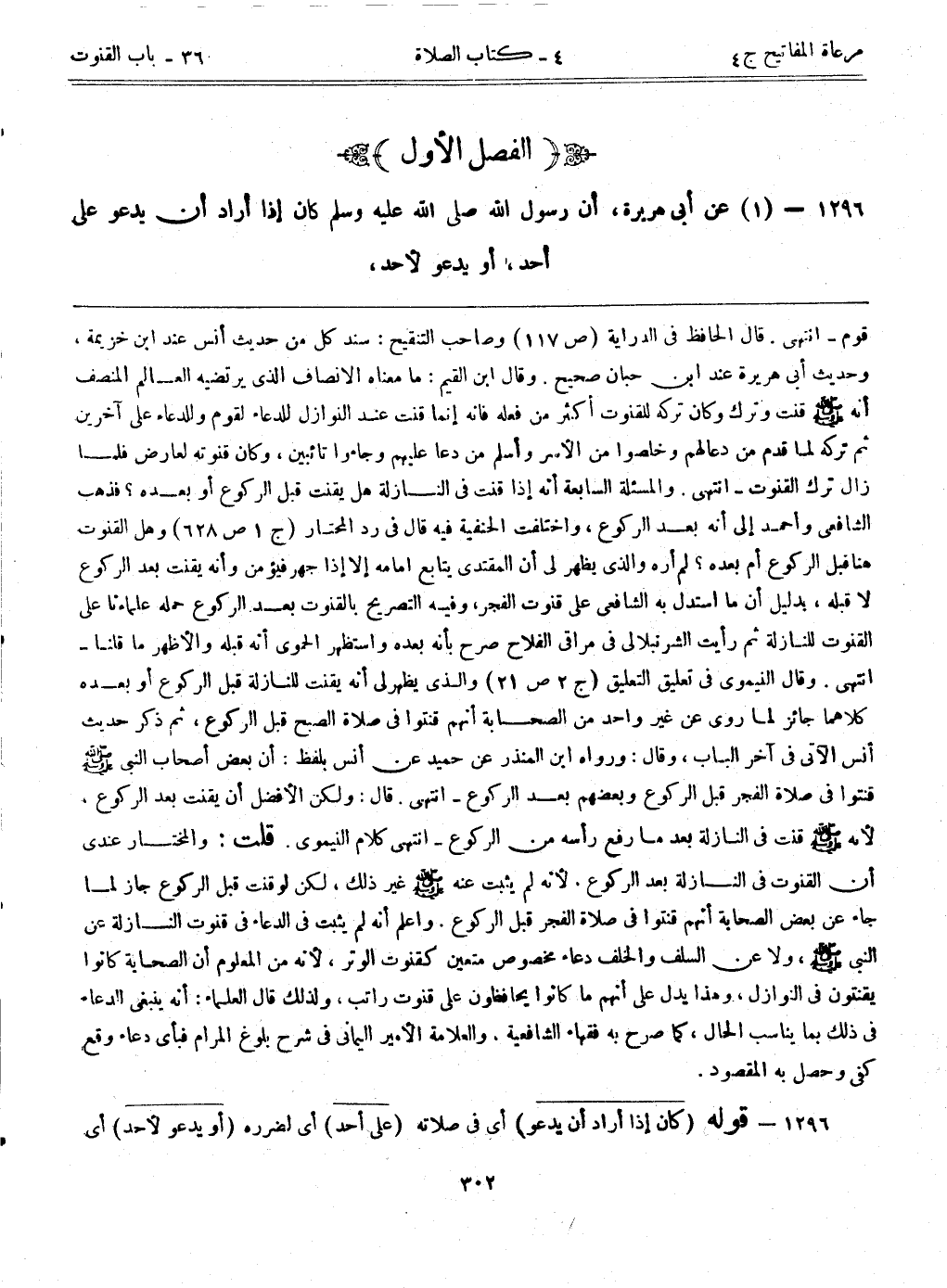 1296- (1) عن أبي هريرة، ((أن رسول الله - صلى الله عليه وسلم - كان إذا أراد أن يدعو على أحد، أو يدعو لأحد،