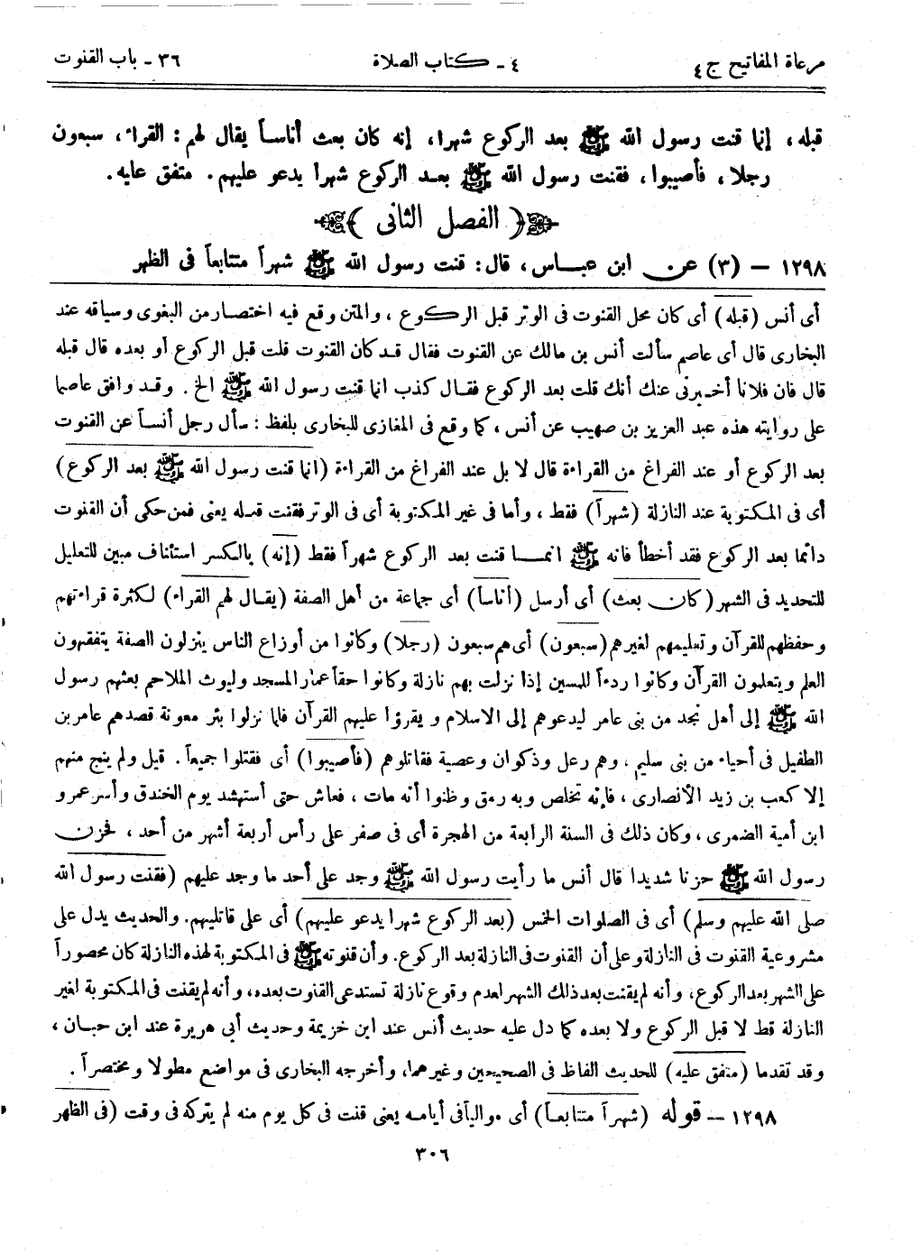 1298- (3) عن ابن عباس، قال: ((قنت رسول الله - صلى الله عليه وسلم - شهراً متتابعاً في الظهر