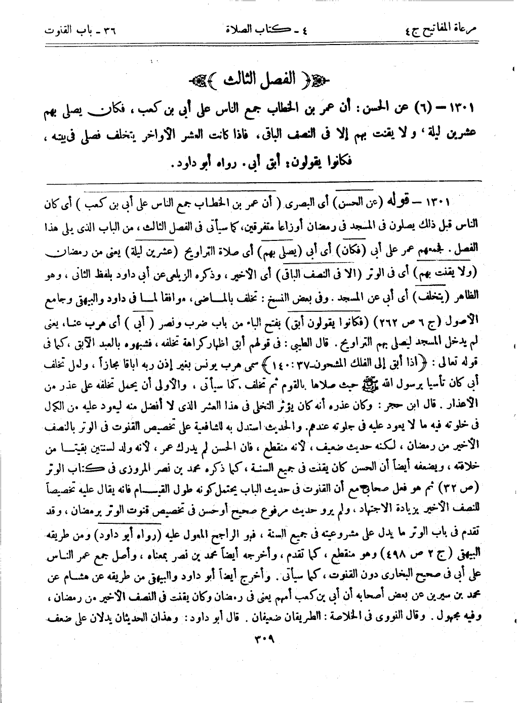 1301- قوله: (عن الحسن) أي البصري. (أن عمر بن الخطاب جمع الناس على أبيّ بن كعب) أي كان الناس قبل ذلك يصلون في المسجد في رمضان أوزعاً متفرقين، كما سيأتي في الفصل الثالث، من الباب الذي يلي هذا الفصل. فجمعهم عمر على أبيّ. (فكان) أي أبي. (يصلي بهم) أي صلاة التراويح. (عشرين ليلة) يعني من رمضان. (ولا يقنت بهم) أي في الوتر. (إلا في النصف الباقي) أي الأخير، وذكره الزيلعي عن أبي داود بلفظ الثاني، وهو الظاهر. (يتخلف) أي أبيّ عن المسجد. وفي بعض النسخ: تخلف بالماضي، موافقاً لما في أبي داود والبيهقي وجامع الأصول (ج6 ص262) . (فكانوا يقولون أبق) بفتح الباء من باب ضرب ونصر. (أبيّ) أي هرب عنا، يعني لم يدخل المسجد ليصلي بهم التراويح. قال الطيبي: في قولهم أبق إظهار كراهة تخلفه، فشبهوه بالعبد الآبق، كما في قوله تعالى: {إذا أبق إلى الفلك المشحون} [37: 140] سمي هرب يونس بغير إذن ربه إباقاً مجازاً، ولعل تخلف أبي كان تأسياً برسول الله - صلى الله عليه وسلم - حيث صلاها بالقوم ثم تخلف، كما سيأتي، والأولى أن يحمل تخلفه على عذر من الأعذار. قال ابن حجر: وكان عذره أنه كان يؤثر التخلي في هذا العشر الذي لا أفضل منه، ليعود عليه من الكمال في خلوته فيه ما لا يعود عليه في جلوته عندهم. والحديث استدل به للشافعية على تخصيص القنوت في الوتر بالنصف الأخير من رمضان، لكنه حديث ضعيف؛ لأنه منقطع، فإن الحسن لم يدرك عمر؛ لأنه ولد لسنتين بقيتا من خلافته، ويضعفه أيضاً أن الحسن كان يقنت في جميع السنة، كما ذكره محمد بن نصر المروزي في كتاب الوتر (ص32) ، ثم هو فعل الصحابي مع أن القنوت في حديث الباب يحتمل كونه طول القيام، فإنه يقال عليه تخصيصاً للنصف الأخير بزيادة الاجتهاد، ولم يرو حديث مرفوع صحيح أو حسن في تخصيص قنوت الوتر برمضان، وقد تقدم في باب الوتر ما يدل على مشروعيته في جميع السنة، فهو الراجح المعول عليه. (رواه أبوداود) ومن طريقة البيهقي (ج2 ص498) وهو منقطع، كما تقدم، وأخرجه أيضاً محمد بن نصر بمعناه، وأصل جمع عمر الناس على أبيّ في صحيح البخاري دون القنوت، كما سيأتي. وأخرج أيضاً أبوداود والبيهقي من طريقه عن هشام عن محمد بن سيرين عن بعض أصحابه أن أبيّ بن كعب أمهم يعني في رمضان وكان يقنت في النصف الأخير من رمضان، وفيه مجهول. وقال النووي في الخلاصة: الطريقان ضعيفان. قال أبوداود: وهذان الحديثان يدلان على ضعف
