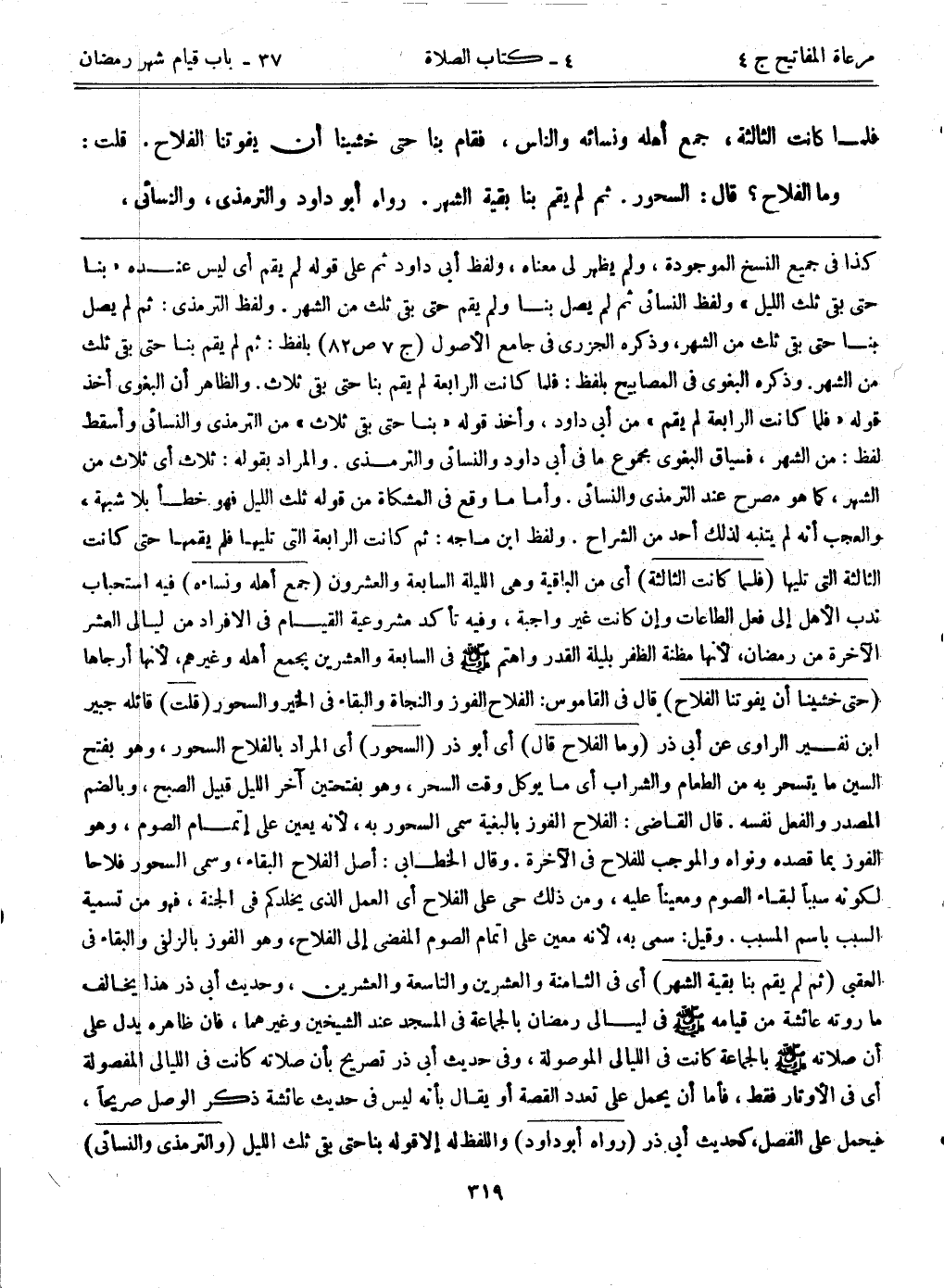 كذا في جميع النسخ الموجودة، ولم يظهر لي معناه، ولفظ أبي داود ثم على قوله لم يقم أي ليس عنده "بنا حتى بقي ثلث الليل" ولفظ النسائي ثم لم يصل بنا ولم يقم بنا حتى بقي ثلث من الشهر. ولفظ الترمذي: ثم لم يصل بنا حتى بقي ثلث من الشهر، وذكره الجزري في جامع الأصول (ج7 ص82) بلفظ: ثم لم يقم بنا حتى بقي ثلث من الشهر. وذكره البغوي في المصابيح بلفظ: فلما كانت الرابعة لم يقم بنا حتى بقي ثلاث. والظاهر أن البغوي أخذ قوله "فلما كانت الرابعة لم يقم" من أبي داود، وأخذ قوله "بنا حتى بقي ثلاث" من الترمذي والنسائي وأسقط لفظ: من الشهر، فسياق البغوي مجموع ما في أبي داود والنسائي والترمذي. والمراد بقوله: ثلاث أي ثلاث من الشهر، كما هو مصرح عند الترمذي والنسائي. وأما ما وقع في المشكاة من قوله: ثلث الليل فهو خطأ بلا شبهة، والعجب أنه لم يتنبه لذلك أحد من الشراح. ولفظ ابن ماجه: ثم كانت الرابعة التي تليها فلم يقمها حتى كانت الثالثة التي تليها. (فلما كانت الثالثة) أي من الباقية وهي الليلة السابعة والعشرون (جمع أهله ونساءه) فيه استحباب ندب الأهل إلى فعل الطاعات وإن كانت غير واجبة، وفيه تأكد مشروعية القيام في الإفراد من ليالي العشر الآخرة من رمضان؛ لأنها مظنة الظفر بليلة القدر، واهتم - صلى الله عليه وسلم - في السابعة والعشرين بجمع أهله وغيرهم؛ لأنها أرجاها. (حتى خشينا أن يفوتنا الفلاح) قال في القاموس: الفلاح الفوز والنجاة والبقاء في الخير والسحور. (قلت) قائله جبير بن نفير الراوي عن أبي ذر. (وما الفلاح قال) أي أبوذر. (السحور) أي المراد بالفلاح السحور، وهو بفتح السين ما يتسحر به من الطعام والشراب، أي ما يوكل وقت السحر، وهو بفتحتين آخر الليل قبيل الصبح، وبالضم المصدر والفعل نفسه. قال القاضي: الفلاح الفوز بالبغية، سمي السحور به؛ لأنه يعين على إتمام الصوم، وهو الفوز بما قصده ونواه والموجب للفلاح في الآخرة. وقال الخطابي: أصل الفلاح البقاء، وسمي السحور فلاحاً لكونه سبباً لبقاء الصوم ومعيناً عليه، ومن ذلك حي على الفلاح أي العمل الذي يخلدكم في الجنة، فهو من تسمية السبب باسم المسبب. وقيل: سمي به لأنه معين على إتمام الصوم المفضي إلى الفلاح، وهو الفوز بالزلفى والبقاء في العقبى. (ثم لم يقم بنا بقيه الشهر) أي في الثامنة والعشرين والتاسعة والعشرين، وحديث أبي ذر هذا يخالف ما روته عائشة من قيامه - صلى الله عليه وسلم - في ليالي رمضان بالجماعة في المسجد عند الشيخين وغيرهما، فإن ظاهره يدل على أن صلاته - صلى الله عليه وسلم - بالجماعة كانت في الليالي الموصولة، وفي حديث أبي ذر تصريح بأن صلاته كانت في الليالي المفصولة، أي في الأوتار فقط، فأما أن يحمل على تعدد القصة أو يقال بأنه ليس في حديث عائشة ذكر الوصل صريحاً، فيحمل على الفصل، كحديث أبي ذر. (رواه أبوداود) واللفظ له إلا قوله: بنا حتى بقي ثلث الليل. (والترمذي والنسائي)